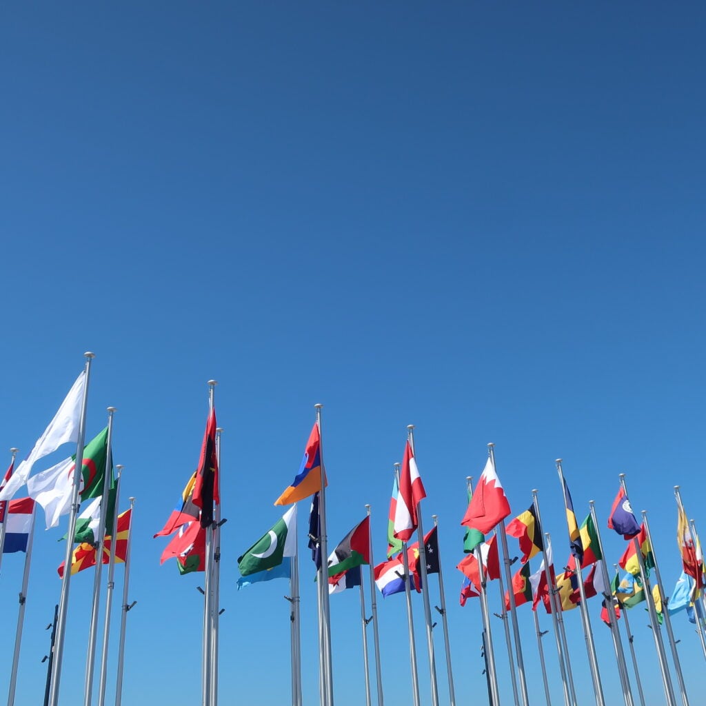 青空をバックに沢山の国旗が風にそよぐ様子は圧巻の景色。