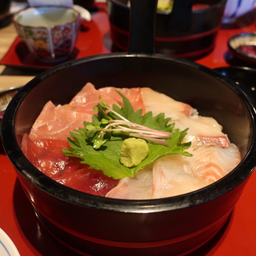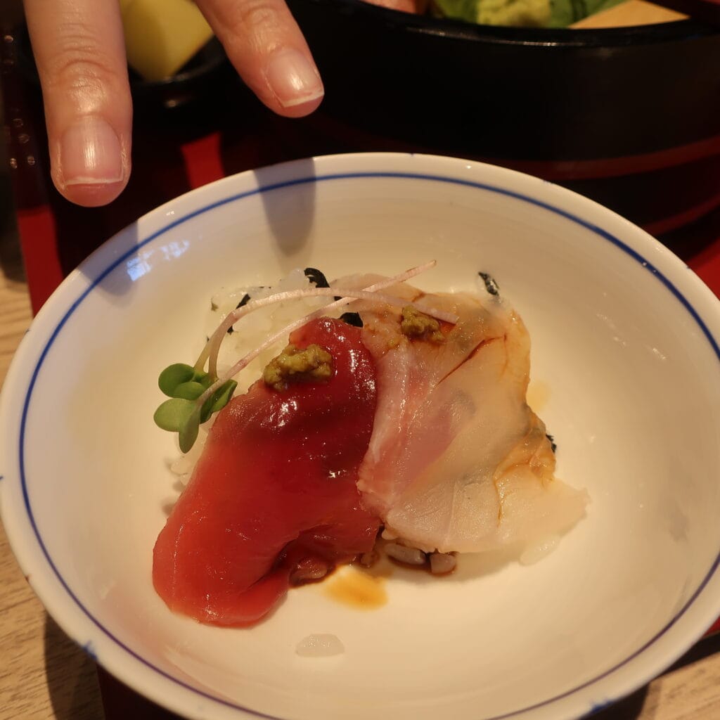 今回私たちは看板メニューの「近⼤サラブレッド⿂と近⼤マグロの紅⽩⼿桶寿司」をオーダー。