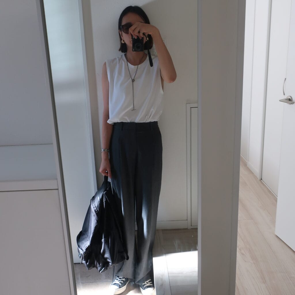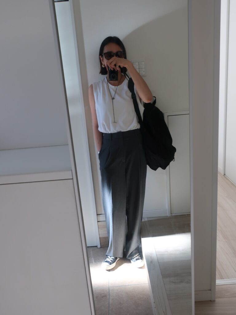 先日ブログにもアップしたUNIQLOのエアリズムノースリーブと、同じくUNIQLOのタックワイドパンツで上下とも風通し良く!