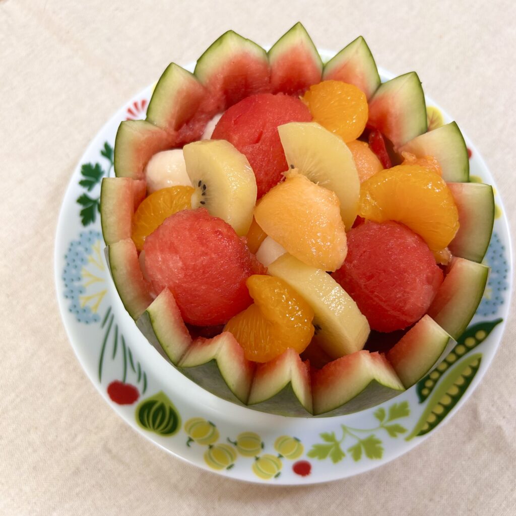 スイカとメロンが同時に手元にあることがなかなかないので、せっかくなら楽しい食べ方を…と思い作ったのが、本日ご紹介する白玉入りのフルーツポンチです。