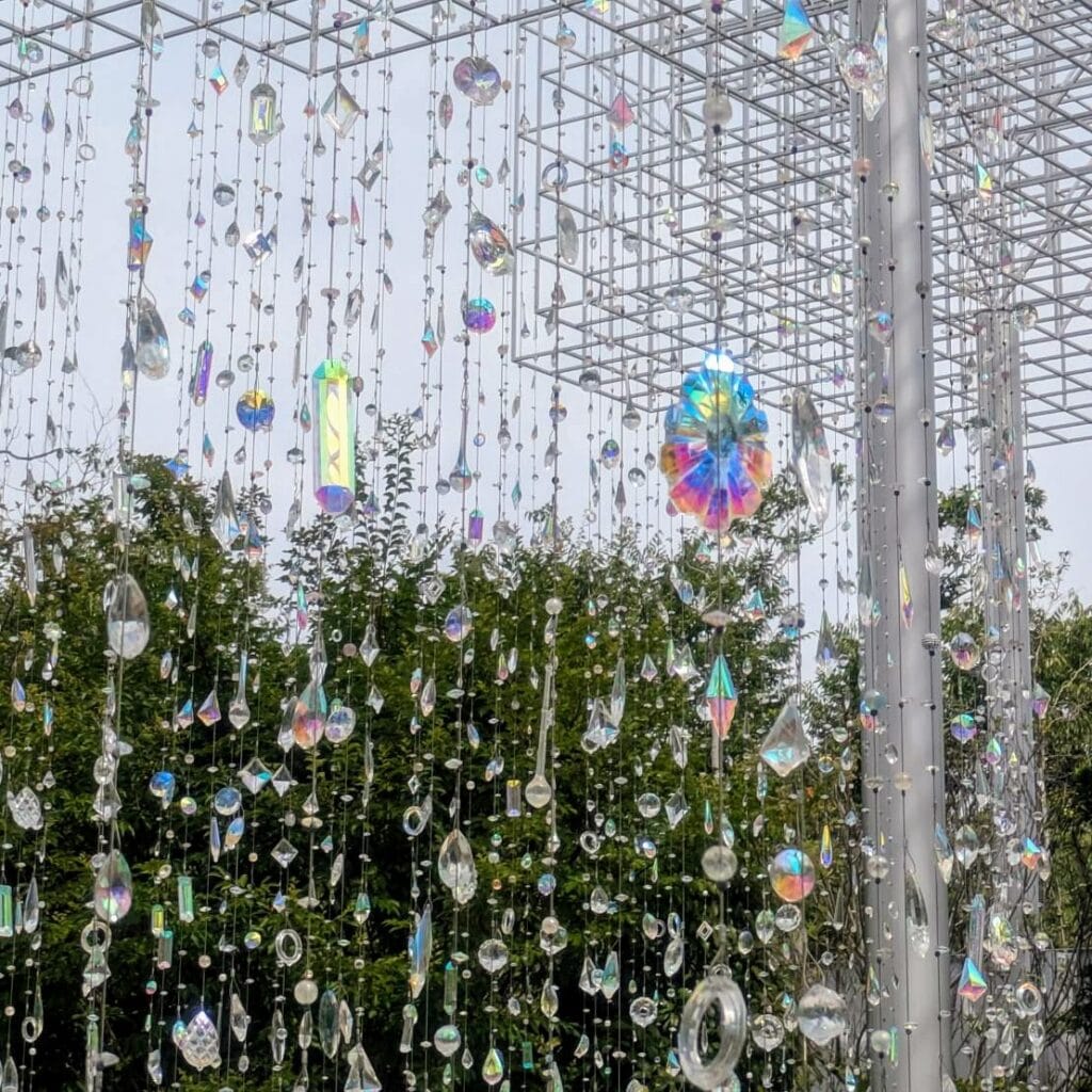とても興味深かったのは、シグネチャーパビリオン Better Co-Beingの作品。太陽の光を反射して輝く無数のクリスタル。ここに人工的に降らせた雨と来場者の動きが加わり、条件が揃うと虹ができるという参加型のアート作品だそう。2人も小さな虹を見つけられたみたいです。