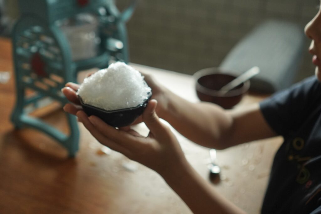 機械自体が軽いので、手でしっかり押さえながら回す必要がありますが、簡単にふわふわのかき氷ができました。
