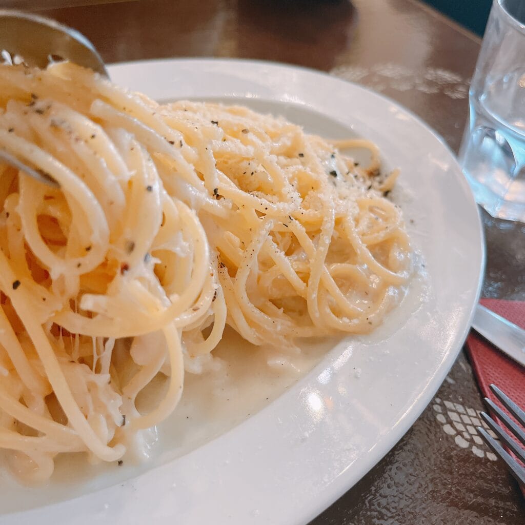 お目当ては、夫が日本で見つけてくれた「カチョエペペ」。チーズの香りと濃厚な味わいが楽しめる、シンプルながら絶品のパスタです。