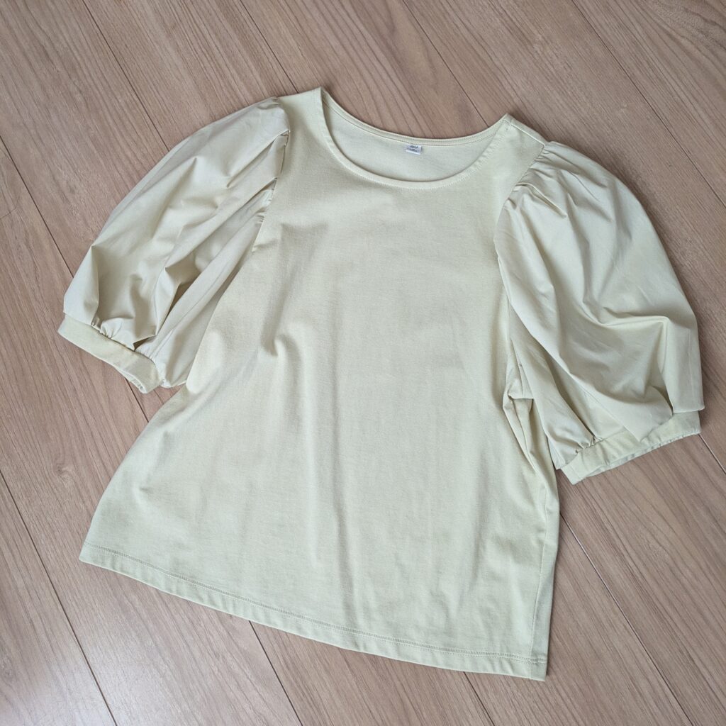 淡いたまごイエロー(実物、写真よりもう少し濃いめです)でオフィスでよく着るネイビーやグレーにも合うし、袖の程よいボリューム感がとても可愛い♡