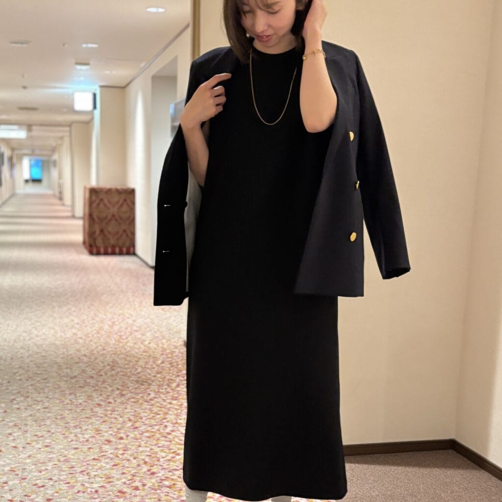 先日ホテルで食事をする際はこちらのワンピの上から同じくミラオーウェンの紺ジャケットを。