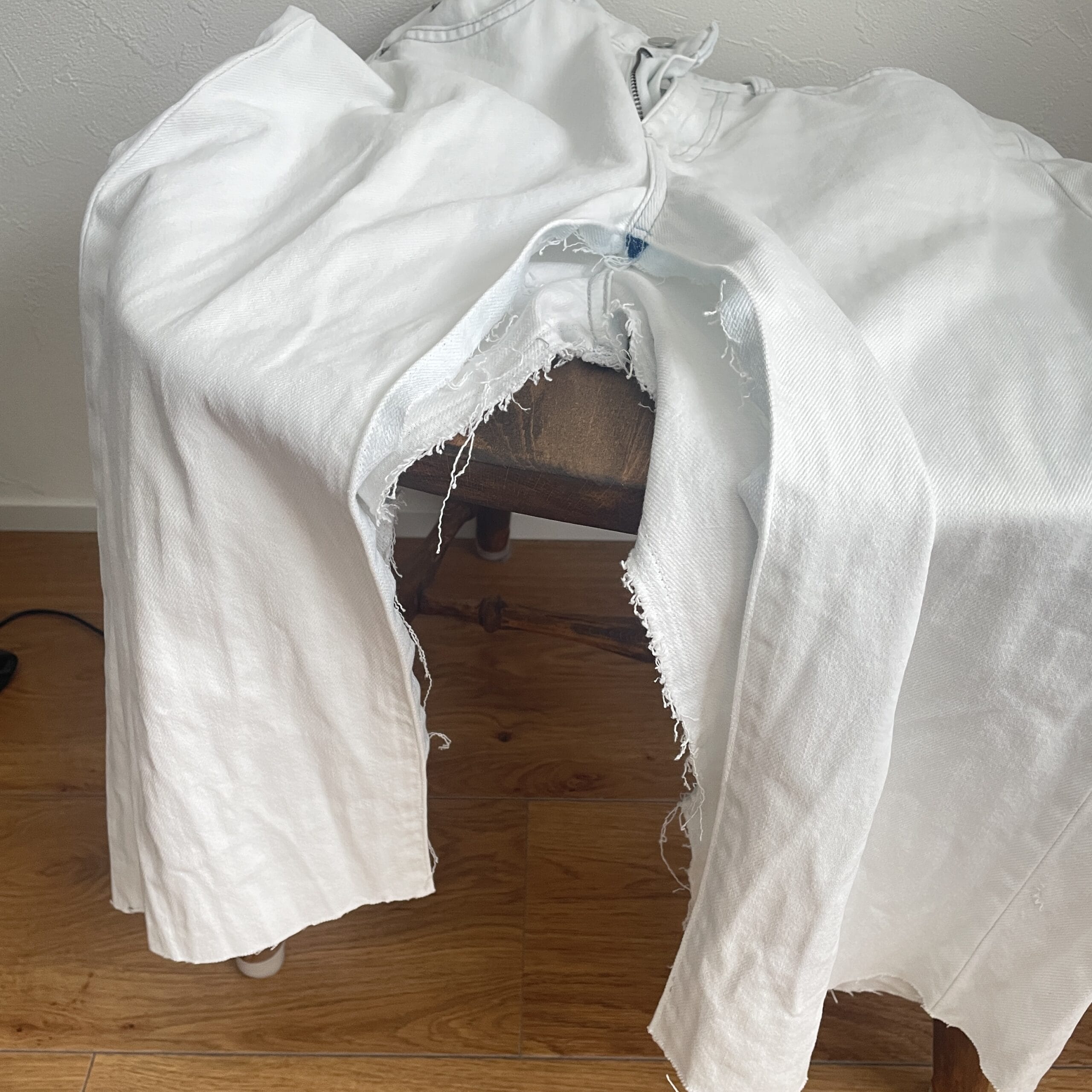 まずは、裾を好みの長さにカットしてから、内股の縫い目をほどいていきます。