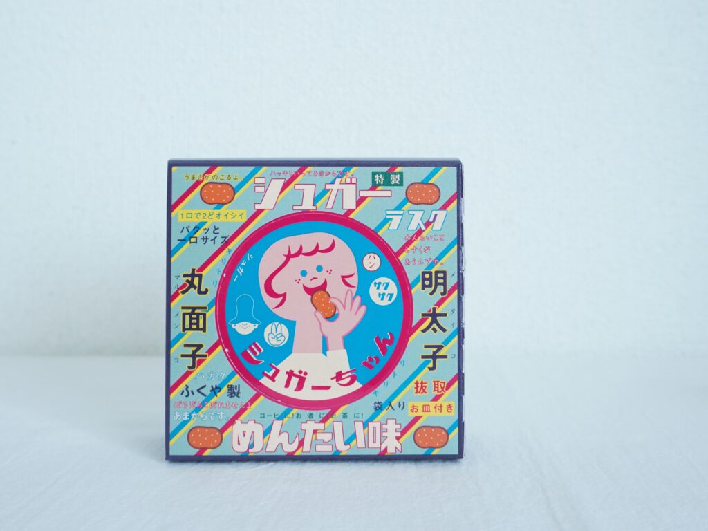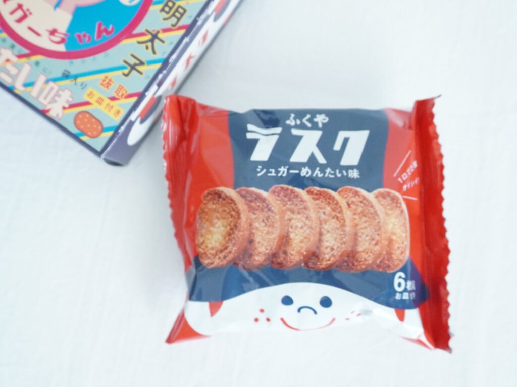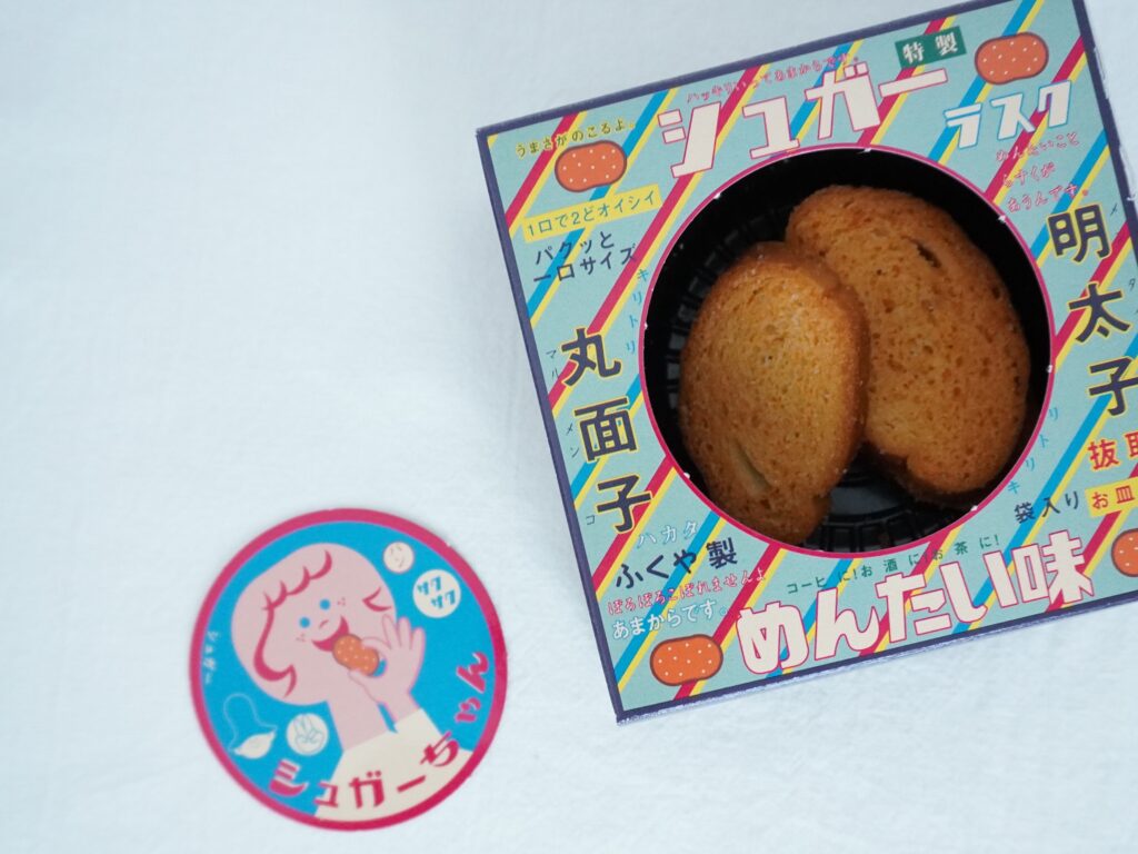 シュガーとめんたいこがコラボ!!そして、ラスク?!とパッケージを見ながら、どんなお菓子なんだ?と不思議に思いながら開封。