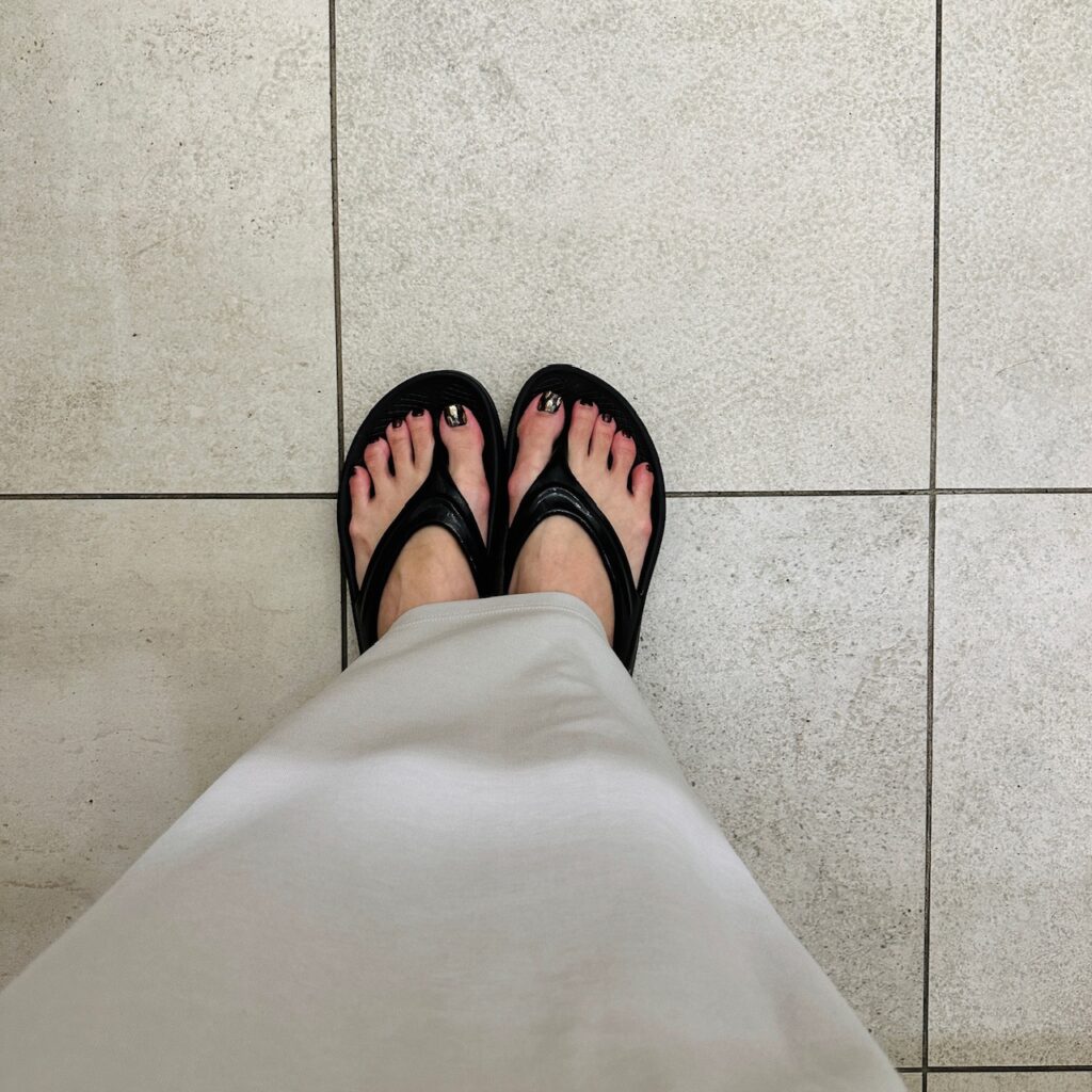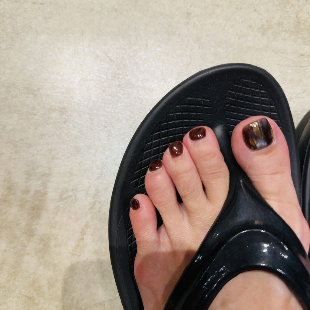 黒いサンダルに濃い色のネイルがしっかりなじみます。足元がまとまっているので白いパンツを履いてもネイルだけ浮くこともありません。