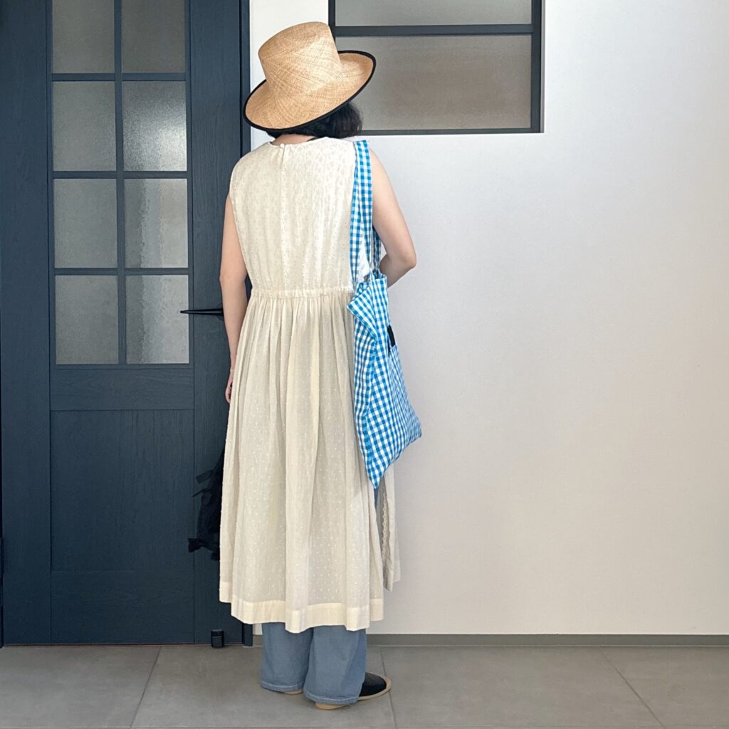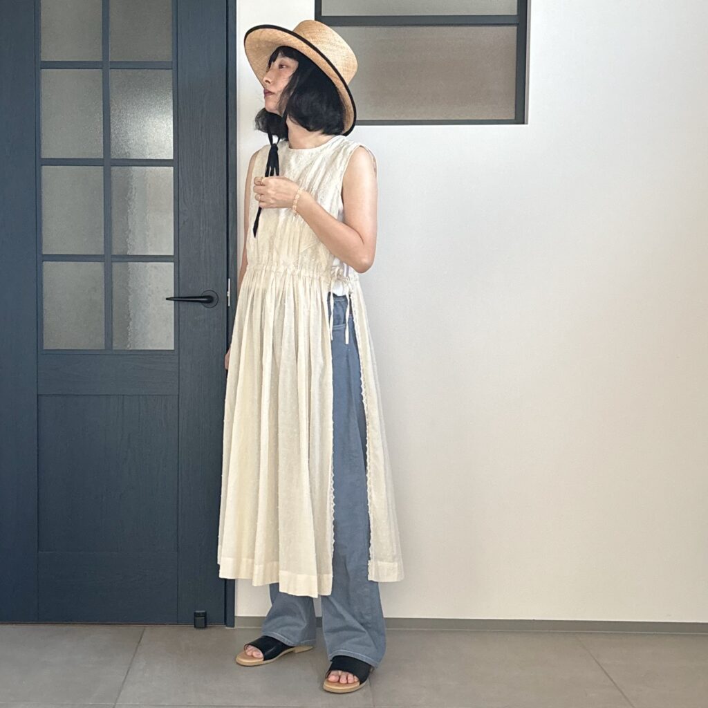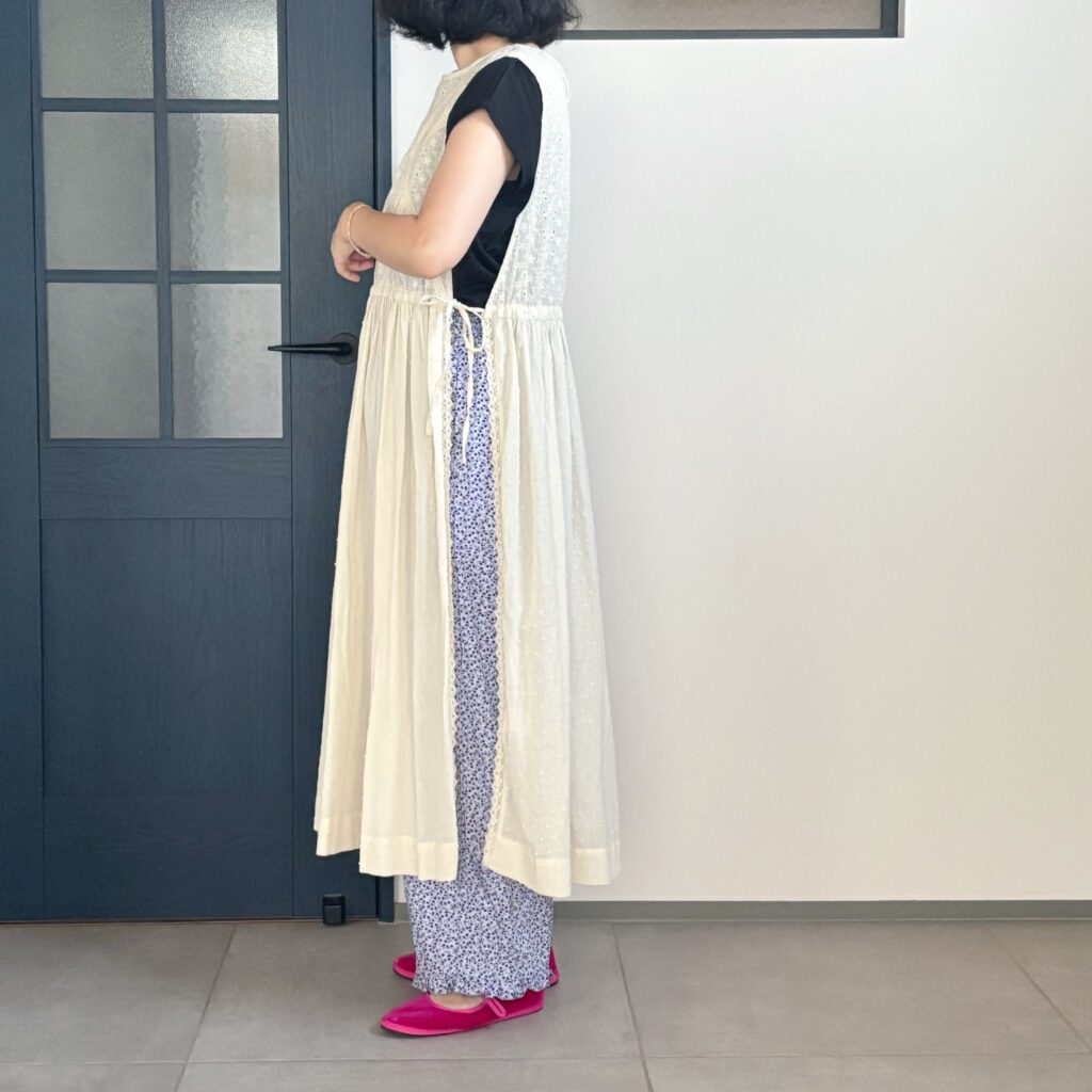 Tシャツを重ねようか迷いましたが、公式のモデルさんが白タンクトップを重ねていたのが涼しげで素敵だったので、真似っこして潔くノースリーブで。(大人の二の腕全開でごめんなさい)