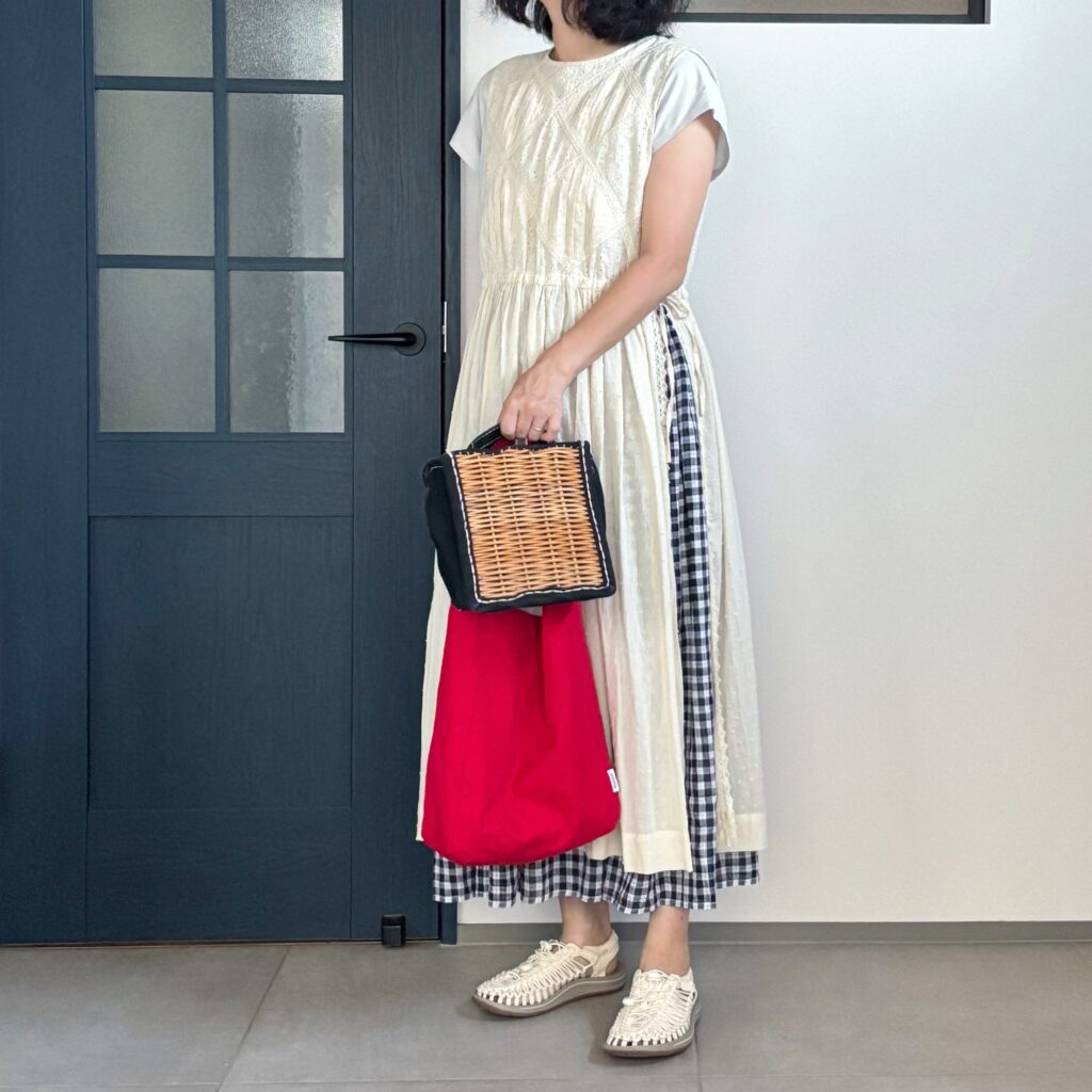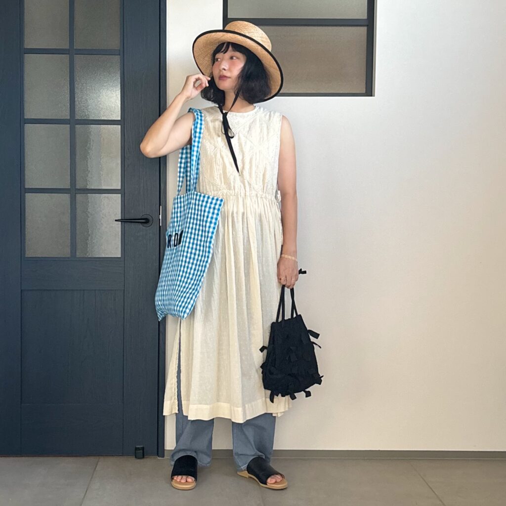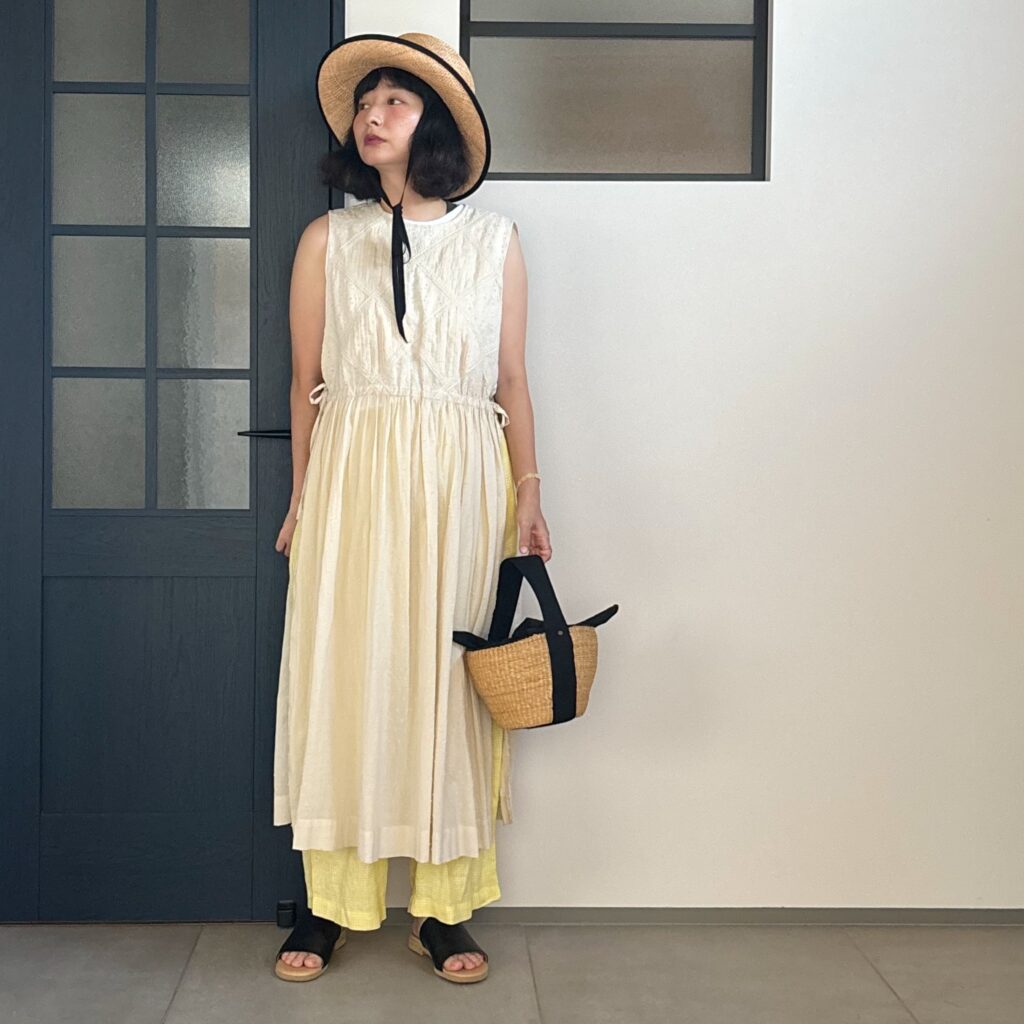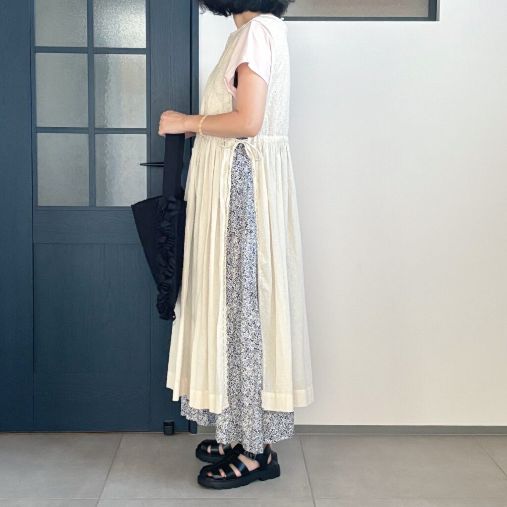 Tシャツを重ねようか迷いましたが、公式のモデルさんが白タンクトップを重ねていたのが涼しげで素敵だったので、真似っこして潔くノースリーブで。(大人の二の腕全開でごめんなさい)