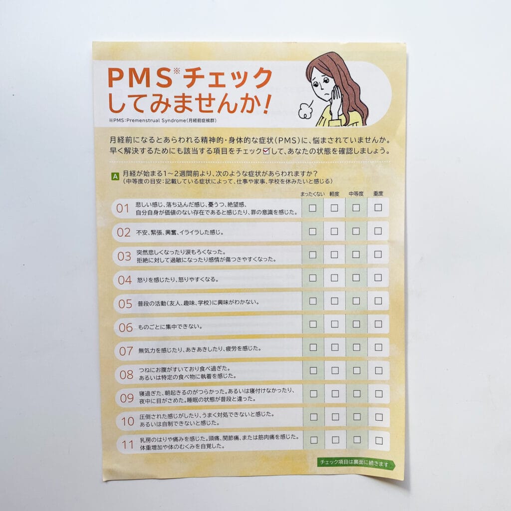 そんな方は大塚製薬さんからいただいた、こちらのPMSチェックシートがおすすめです。とても分かりやすく、自分の今の心と身体を見つめ直すよいきっかけにもなりました。