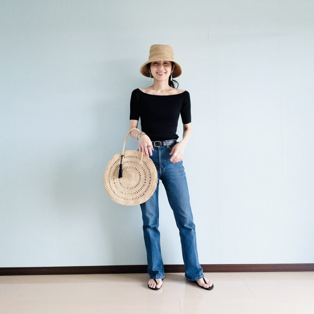 Tシャツとデニムのワンツーコーデも、黒Tシャツではなくデコルテが綺麗に見える、オフショルダーに更新。