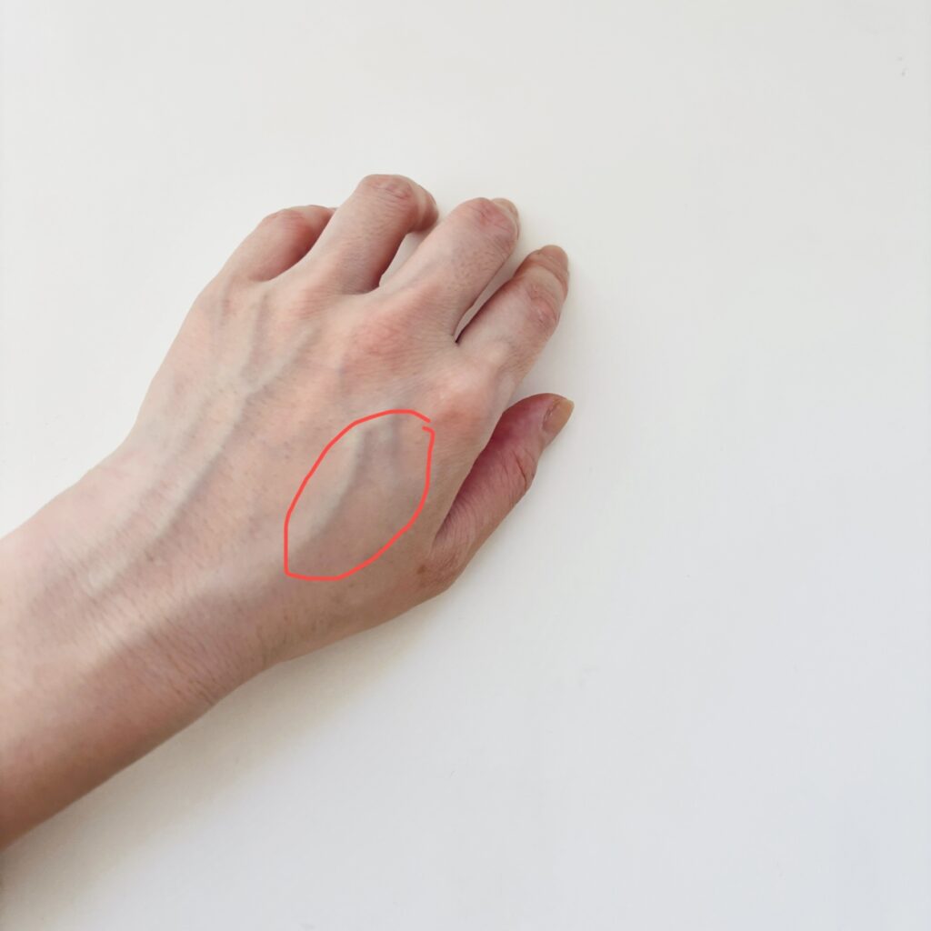 写真ではものすごく分かりにくいのですが…手の甲に薄く広げた赤丸の部分だけ毛穴が目立ちにくくなっていませんか…?笑