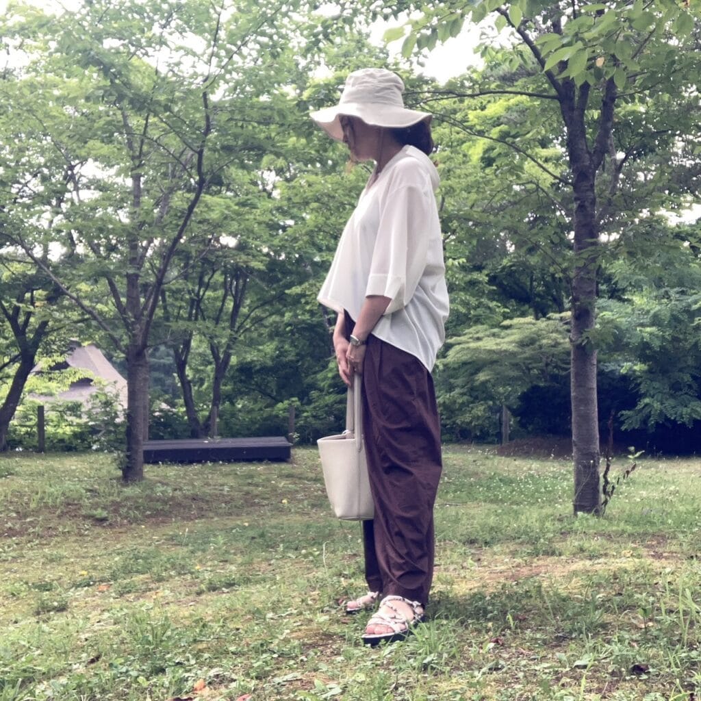 ブラウンのパンツはシワが気にならず、軽く、すぐに乾くのも◎。