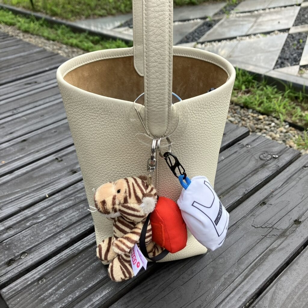 私は大好きなOUTDOOR PRODUCTS×NICIのタイガーと小さくまとまるエコバックのチャームをダイソーで見つけた透明のリングにつけています!