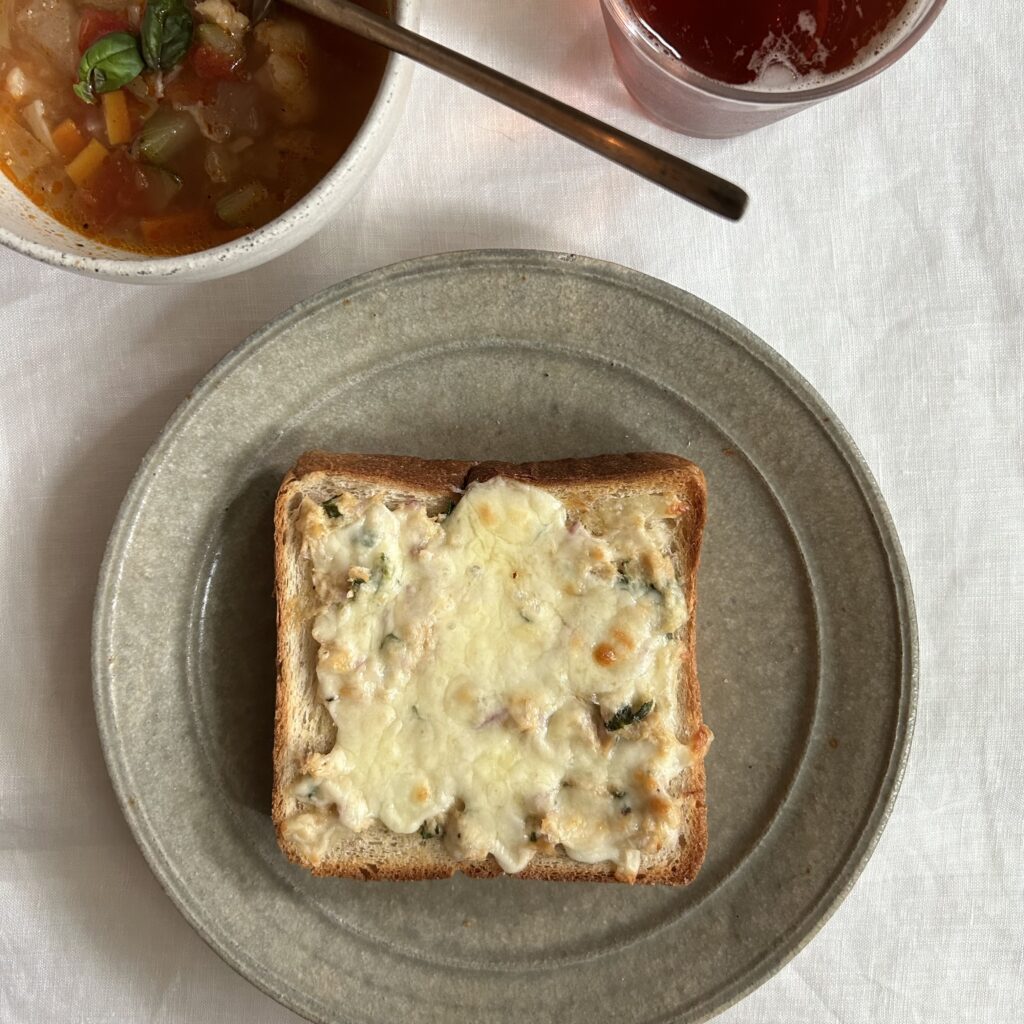 ツナに薬味ミックスと紫玉ねぎスライスを合わせて、マヨネーズ和えにしたものをパンにON、チーズも乗せて焼いたチーズツナトーストがおいしくてよく食べます。