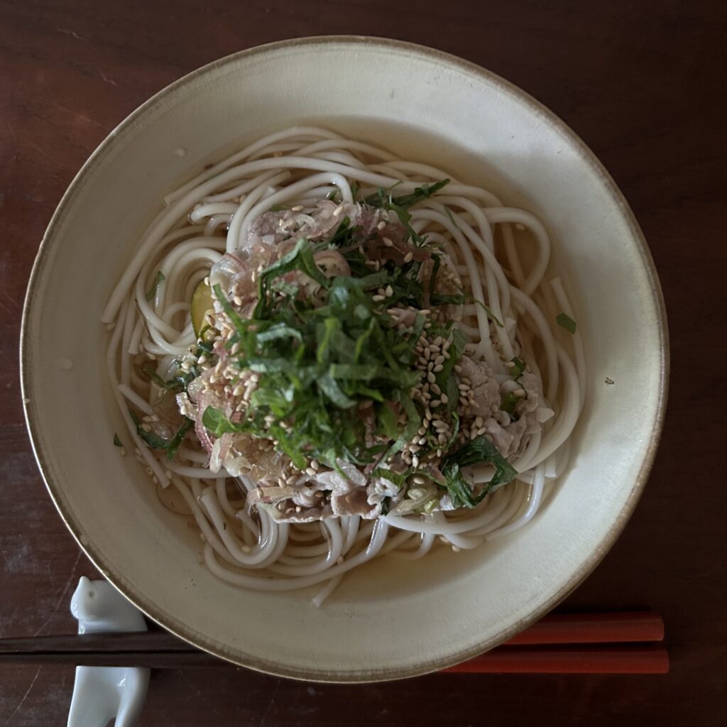 豚しゃぶ、(見えてないけど)ズッキーニのスライス、薬味ミックスをのっけた冷たい麺。