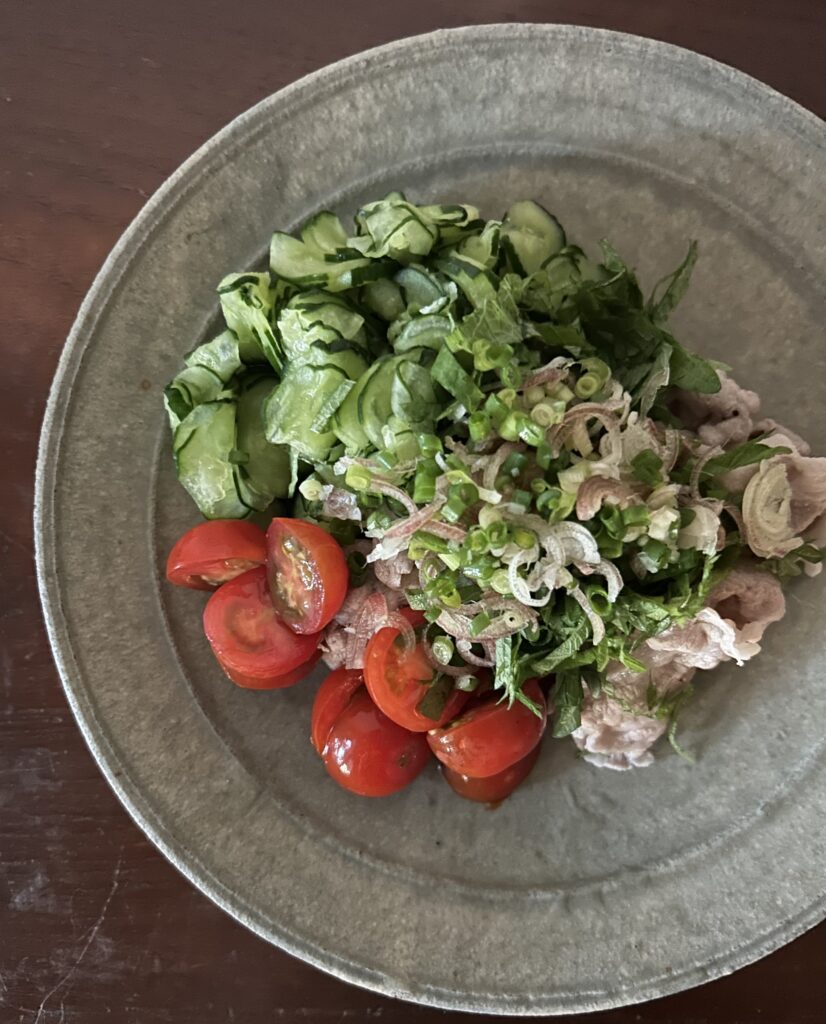 しゃぶしゃぶした豚肉、塩揉みきゅうり、ミニトマト、あとは薬味をてんこ盛り盛り付けて、かぼすとポン酢とオリーブオイルを合わせた簡単ドレッシングでわしわしといただきます。