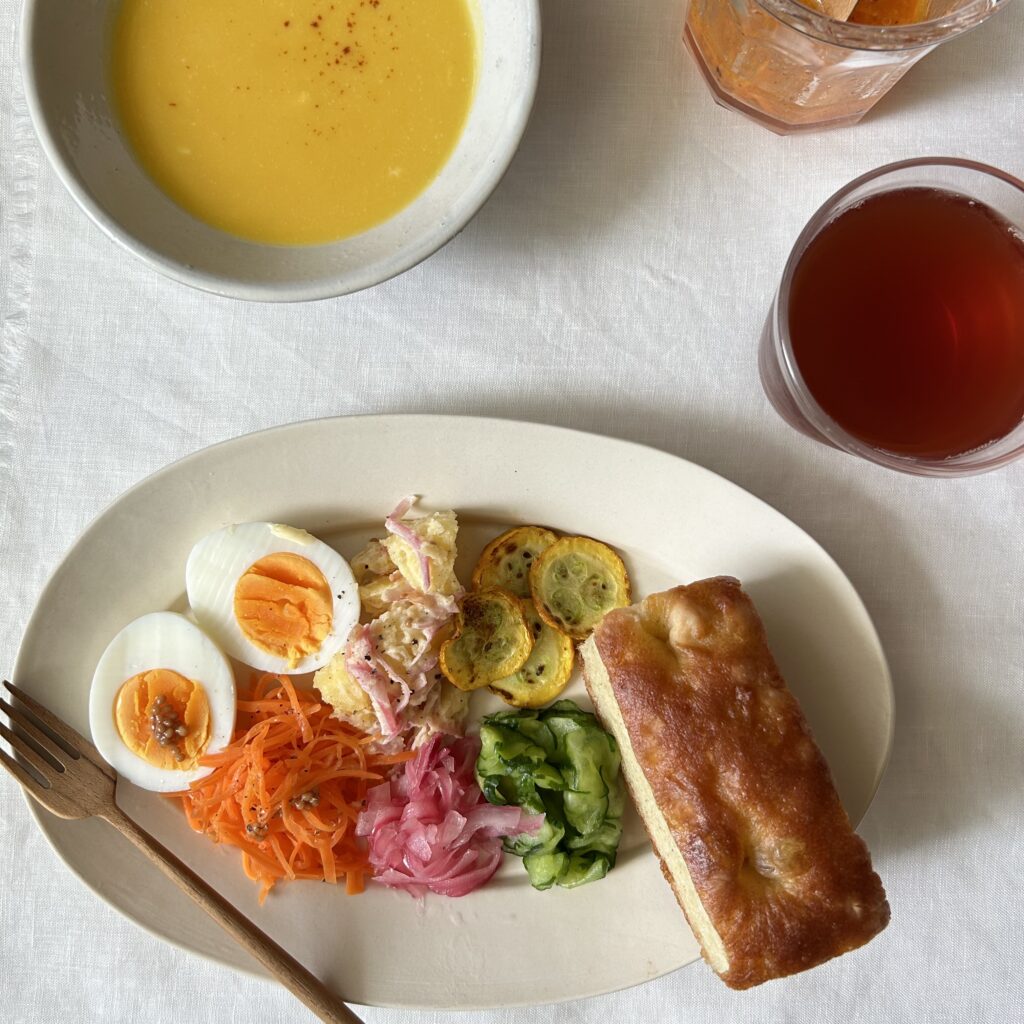 おいしいフォカッチャを買ってきた日は、マリネやサラダを盛り合わせてワンプレートに。
