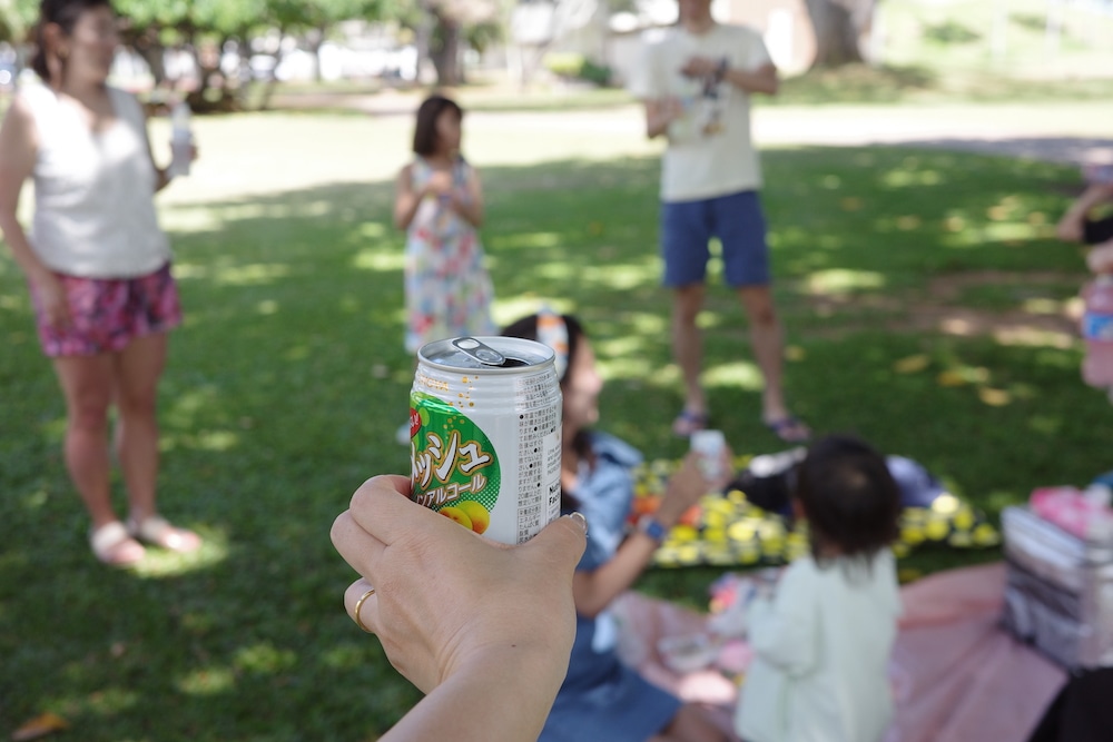 ハワイでは州法によってビーチや公園での飲酒は禁じられているので、ノンアルコールでカンパイっ!