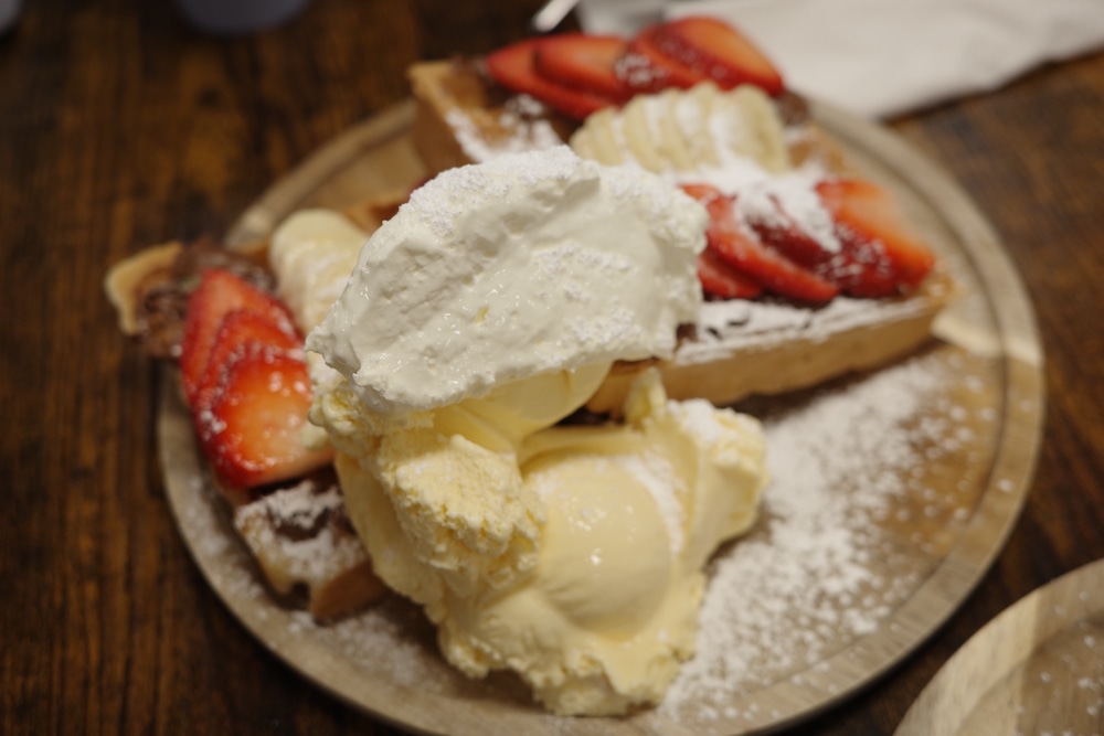 ふわサク食感のワッフルにバニラアイス、生クリームがしっかりと鎮座。生クリーム好きのわたしは目がハートに♡