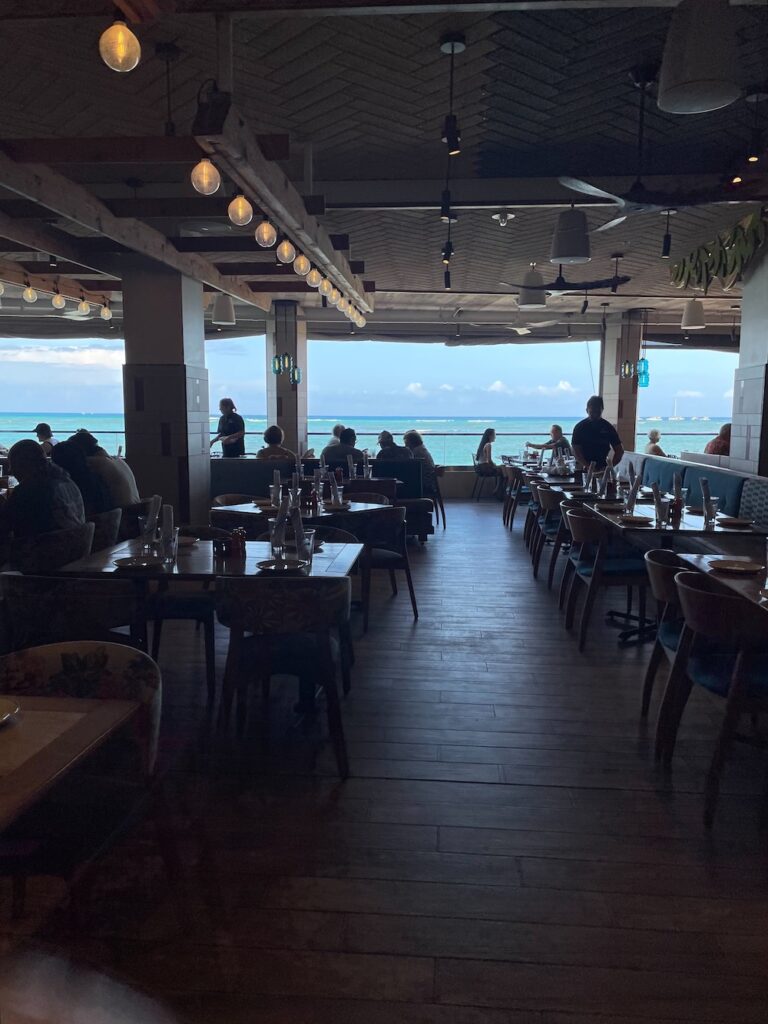店内の通路からはダイヤモンドヘッドも見えて、吹き抜ける風も気持ちよく、とてつもない居心地のよさでした✨ アウトリガーホテルの1Fにあるので、泊まっている方々羨ましいなぁー!