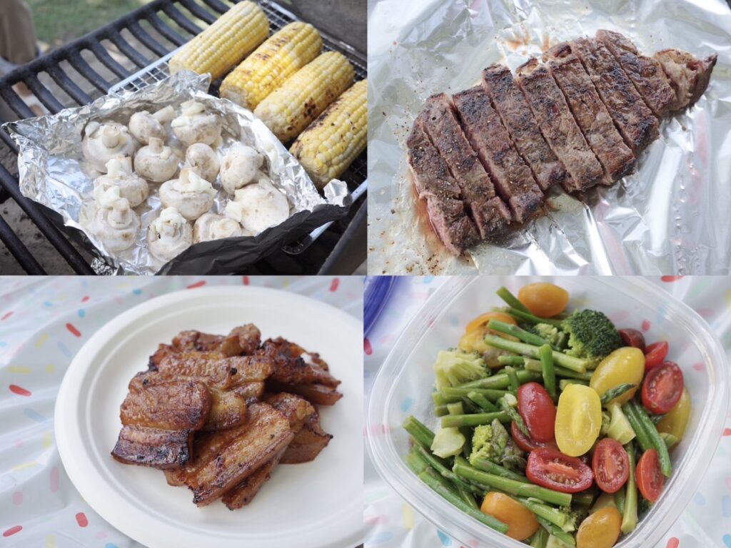 現地のスーパーで調達してくれた牛肉や豚肉に、作ってきてくれていたサラダ、キノコやトウモロコシもあってバランス完璧◎