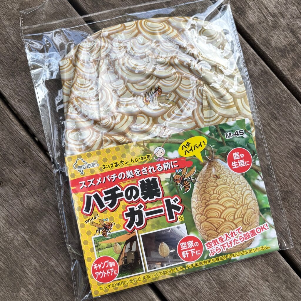 蜂はすでに蜂の巣があるところには巣を作らない傾向があるそうで、フェイクの蜂の巣をぶら下げてガードする、という商品。地元のホームセンターで見つけました◎