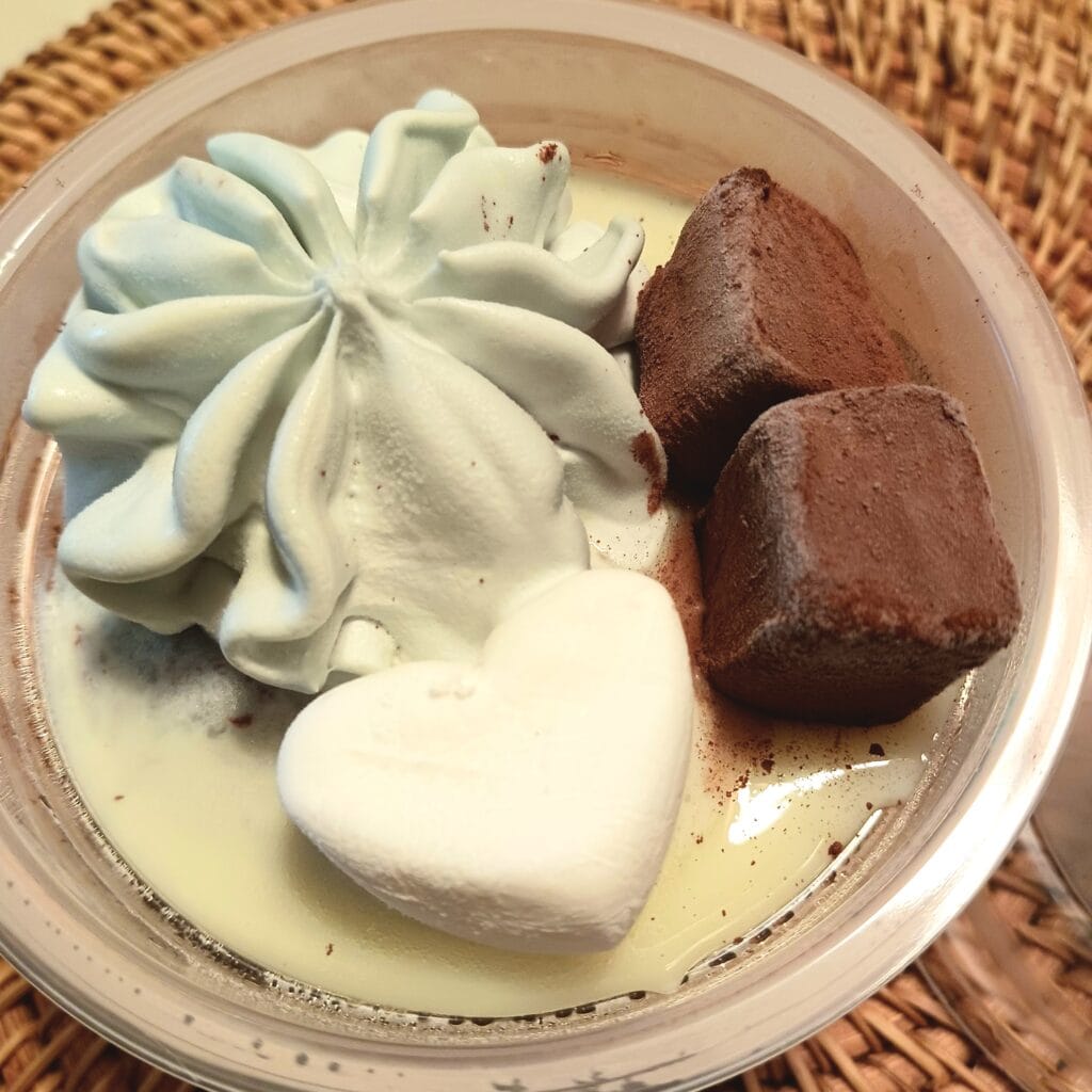 フレーバー毎に、様々なトッピングがされているのも楽しみの1つ♪今回は可愛らしいハート🤍のマシュマロにきゅんでした🥰そしてチョコのわらび餅も!食べる前から美味しい!笑