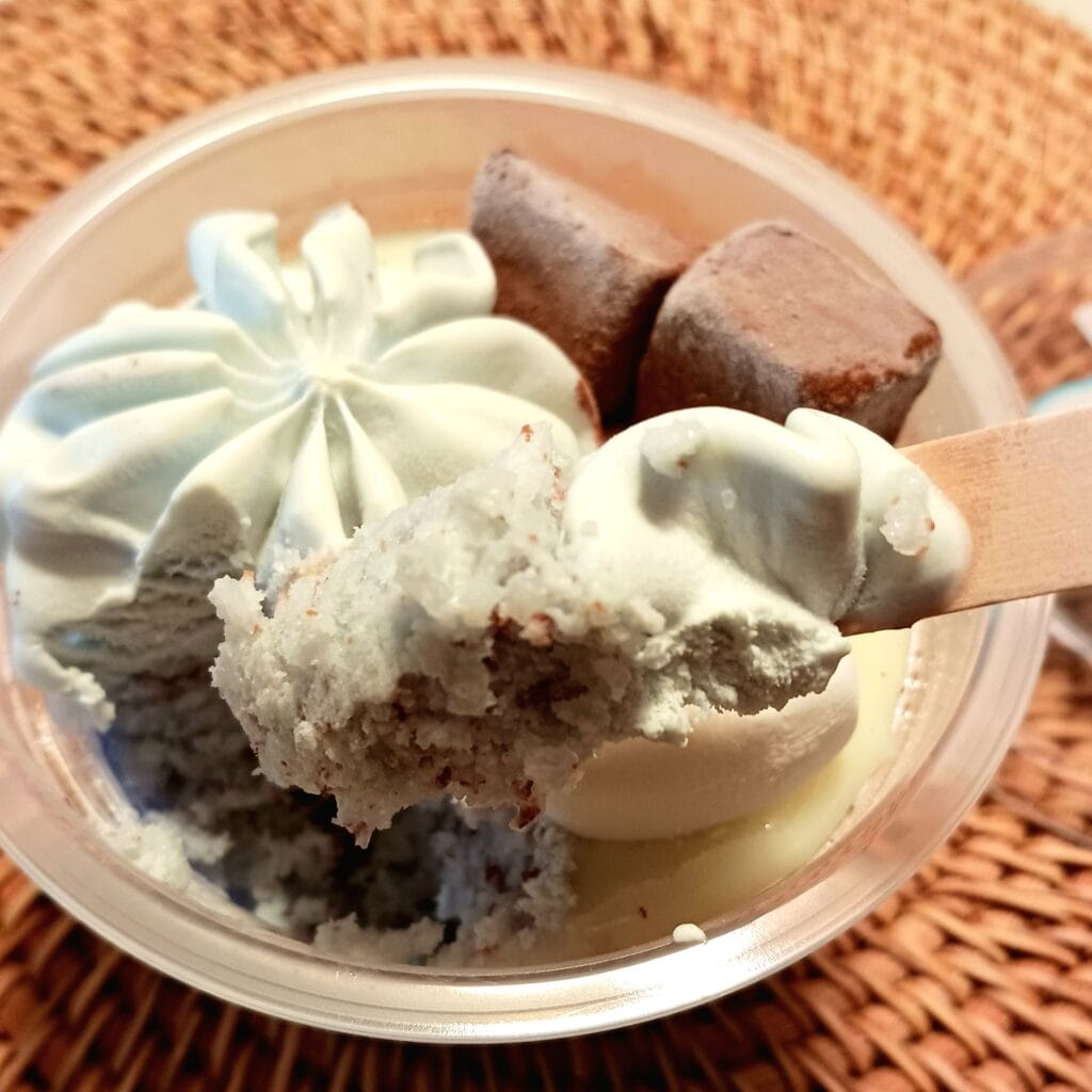 実際に食べてみて、これはチョコミント好きには最高の白くまでした😋チョコミントのアイスクリームに、チョコミント氷。その中から、チョコソースまでもが入っていて、さらに上には練乳も。チョコミントでさっぱりしているので、どれもくどくなく、幸せの甘さです🥰チョコわらび餅がちゃんと柔らかく、これだけでも食べていたい!