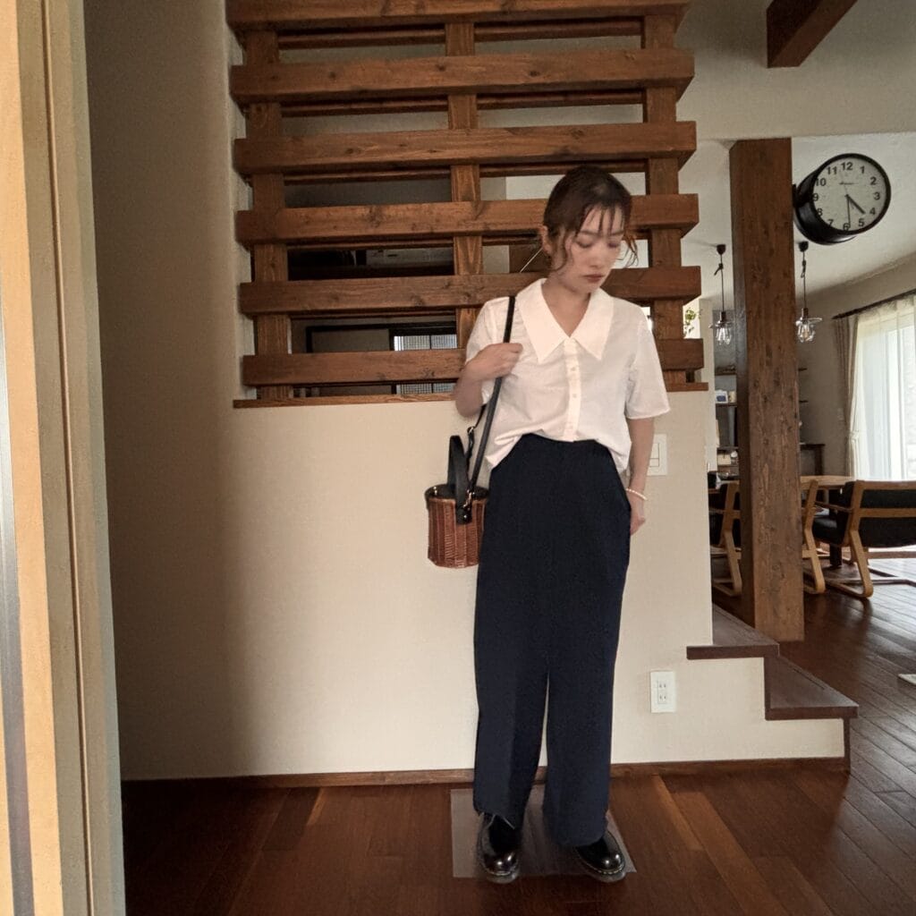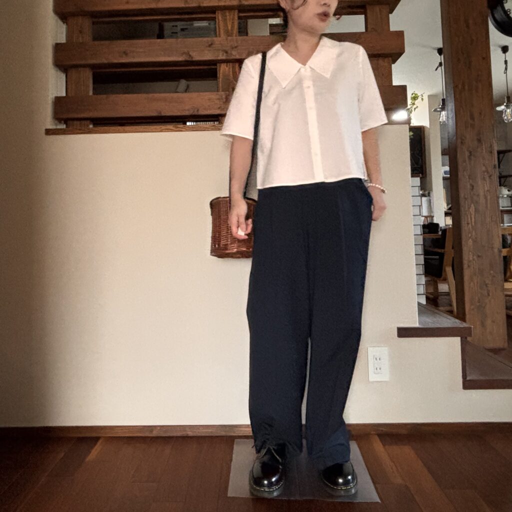 白はマリンテイストっぽくネイビーパンツと合わせて。ネイビーパンツもGUのタックワイドパンツ。100人隊でも人気のこのパンツもついに購入しました。人気なのわかる、合わせやすい