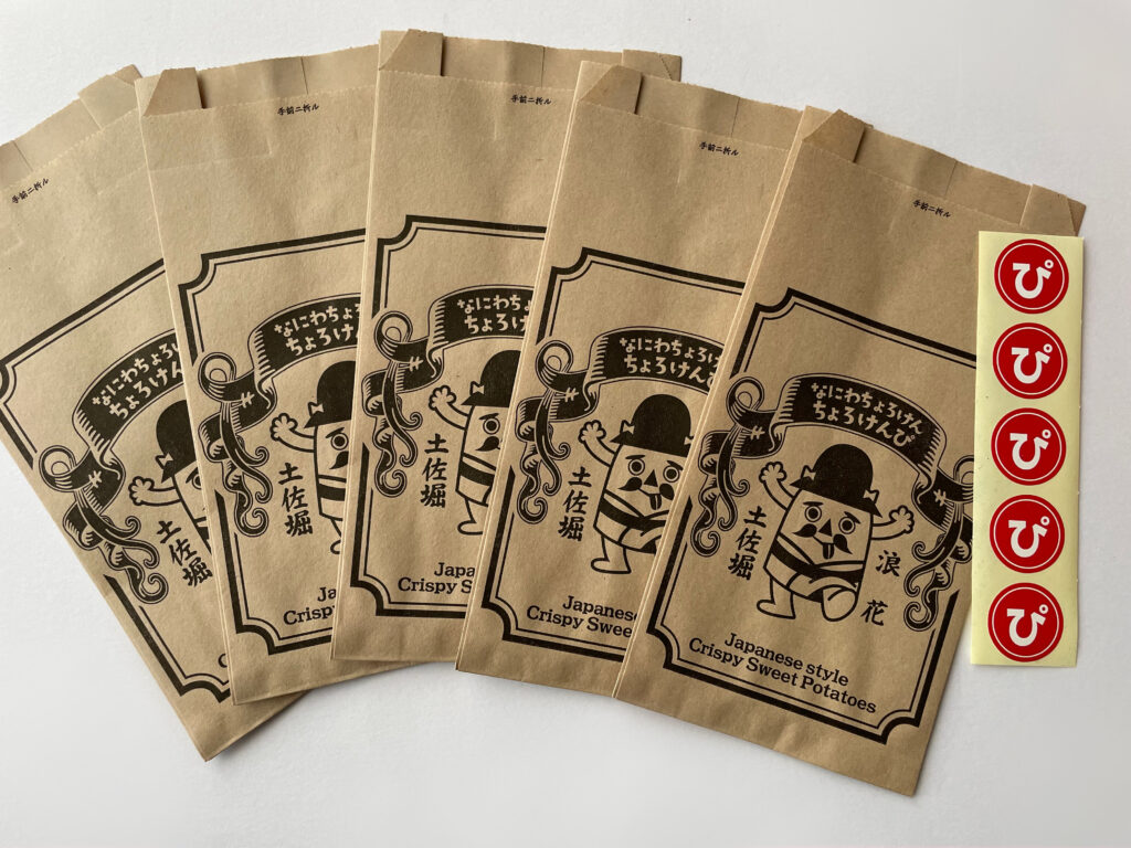 そして…、この「ちょろけん」と、土佐名物の芋けんぴとの夢コラボが実現。江戸時代、全国の名産品が浪花に集まり、土佐からもたくさんの品々が海を渡り「土佐堀」で荷揚げされたのだとか。土佐藩の蔵屋敷や土佐稲荷神社が今もその歴史を伝えており、浪花と土佐の縁を形にしたのがこの「ちょろけんぴ」という訳です。ほんのり塩味がきいているので、「海を渡って来た」イメージにも直結する芋けんぴ。