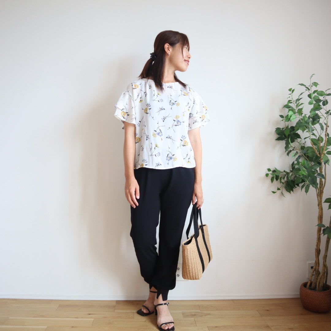 ふんわり袖の花柄トップスに、黒のジョガーパンツを合わせたゆるっとコーデ。柄物トップスも自然に馴染みます。