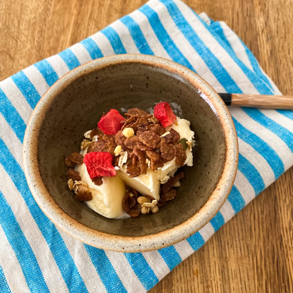 バニラアイスに素材まるごとグラノラ 脂質70%オフをトッピング。