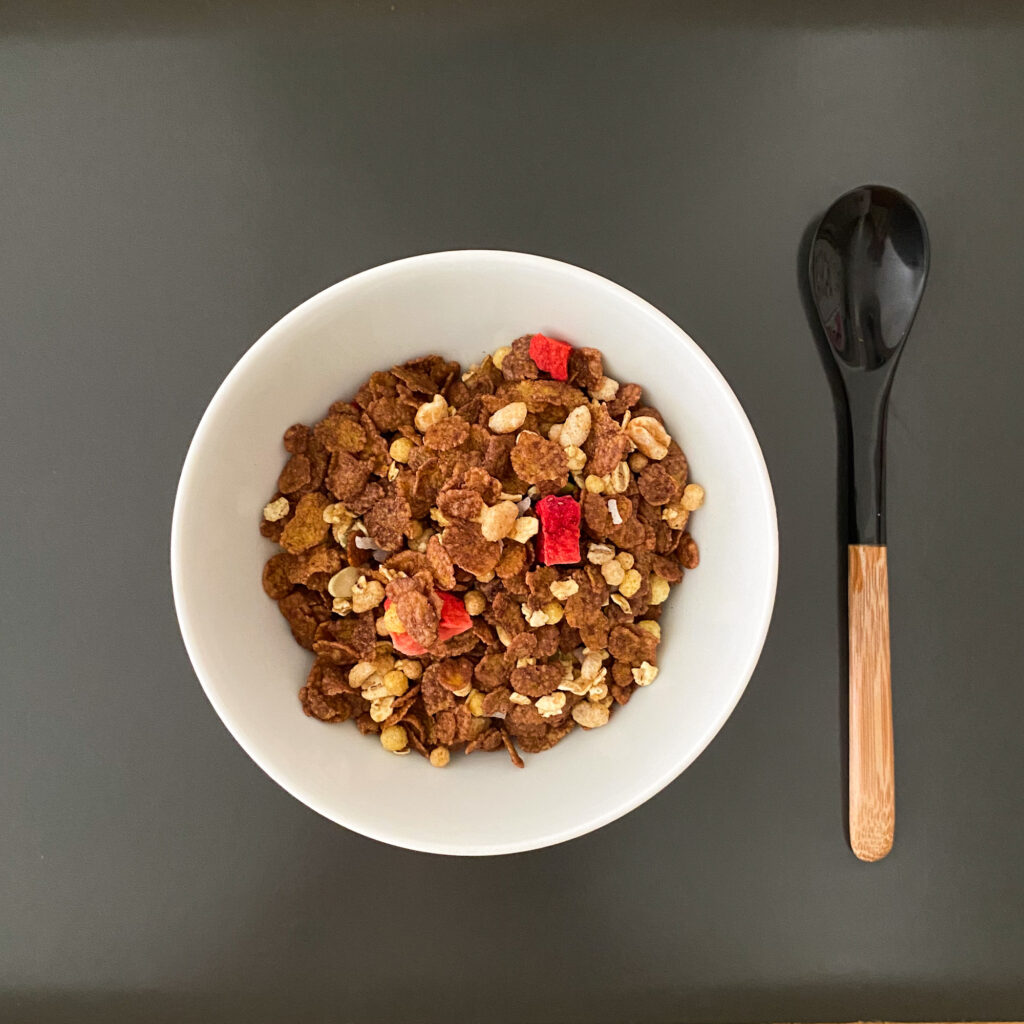 チョコレートフレーク、フリーズドライいちご、パッションフルーツ、ココナッツシュレッド、かぼちゃの種、とうもろこし、全粒大麦、米、小麦とこの1袋に9種類も配合されています。