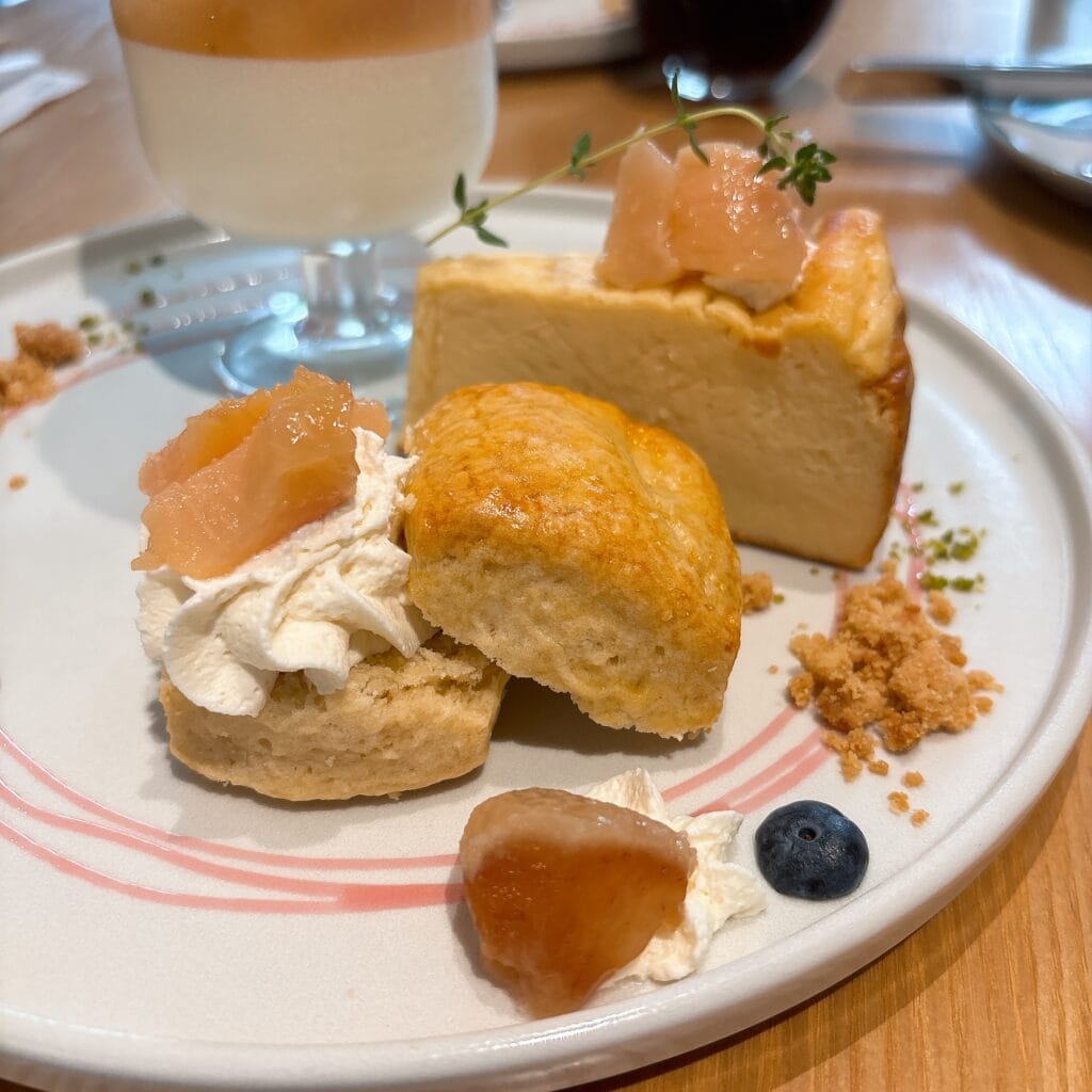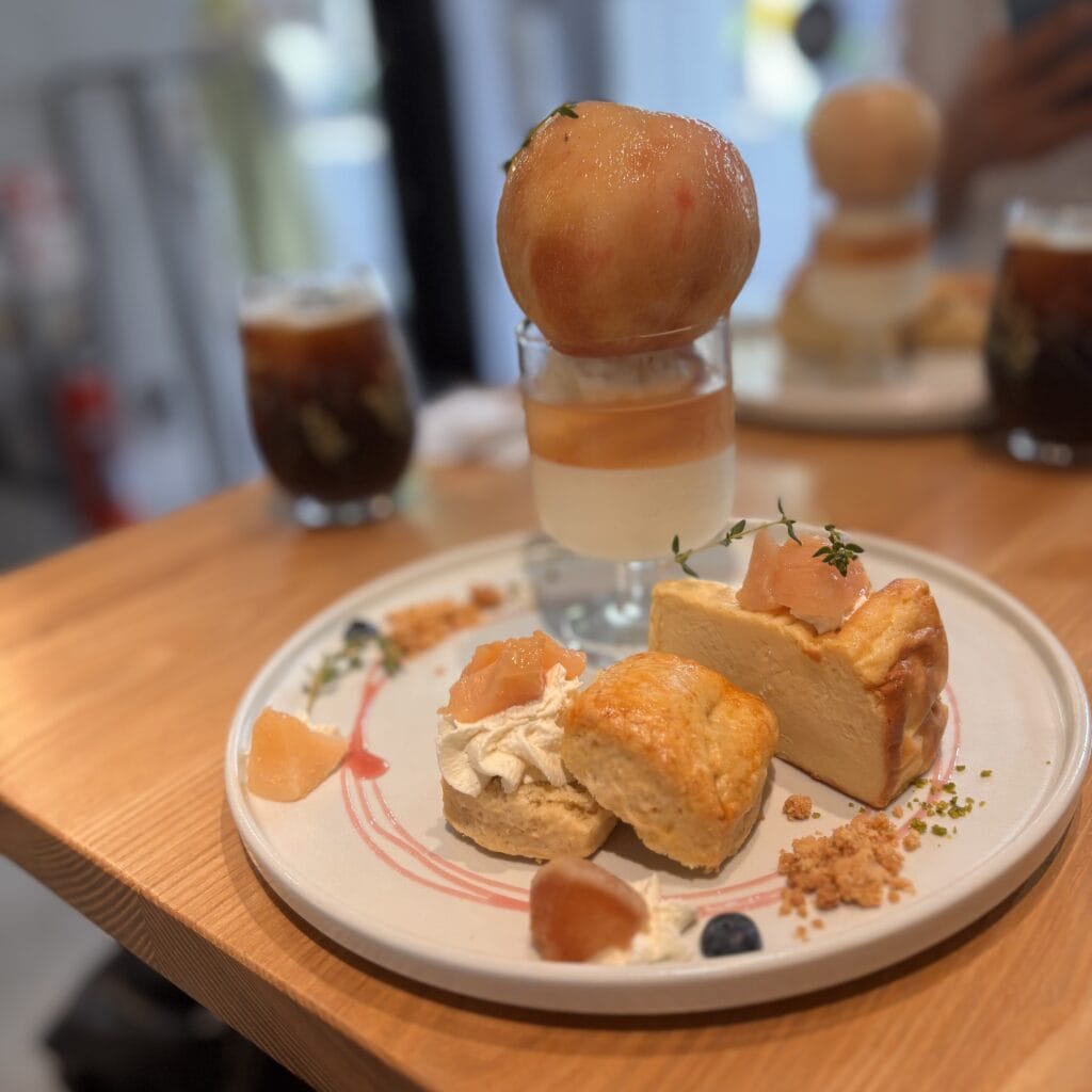 プレートに乗っているのは桃のチーズケーキと桃のスコーンサンド。チーズケーキは濃厚、スコーンは甘さ控えめで生クリームと桃のジャムと合うー!!