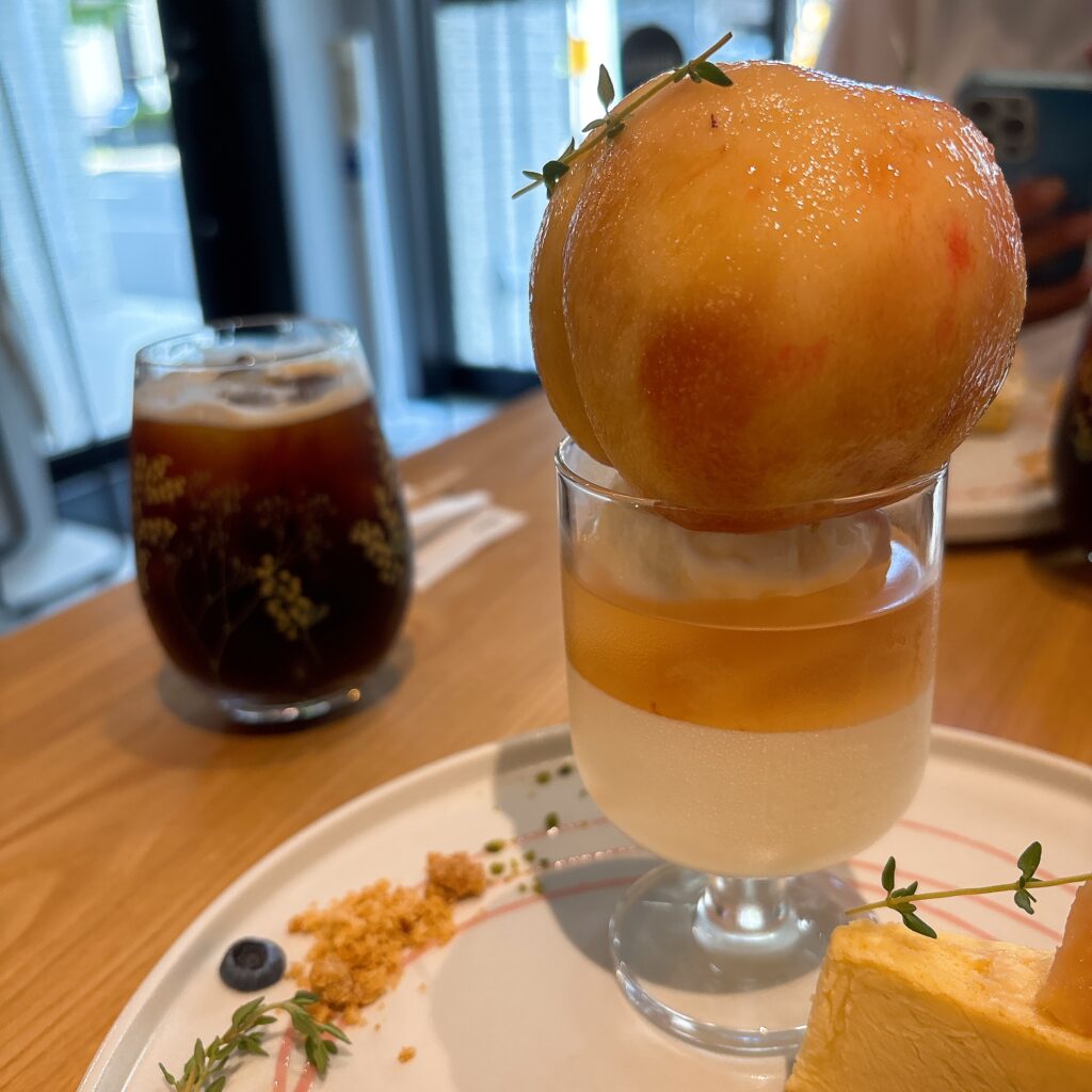 カップの上に桃がまるごと乗っている♡カップの中はレアチーズムース・桃のゼリー・ミルクアイス。このカップの中も物凄く美味しい!