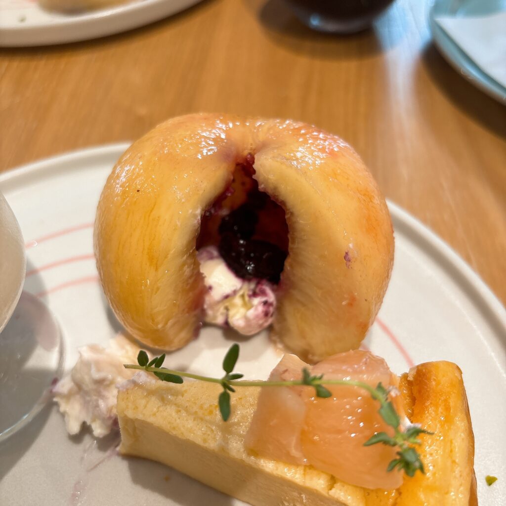 桃は種がくり抜かれていて、中にチーズクリームとブルーベリーソースが入ってて美味~。Umiちゃんが店員さんに「種どうやってくり抜いてるんですか?」って聞いてた🤣