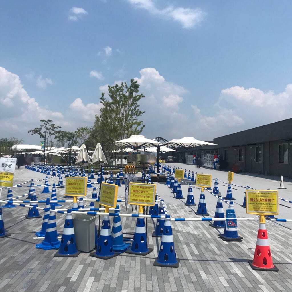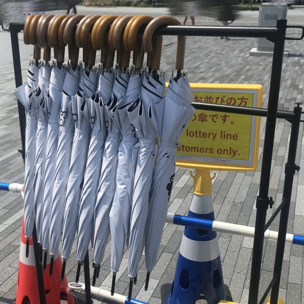 列に並ぶ際、くじ売り場に並ぶ方専用のレンタル日傘がありました!
