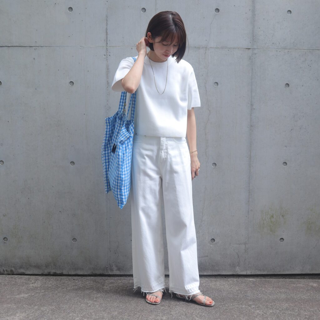 ホワイトデニムと合わせて清潔感たっぷりのホワイトコーデ。