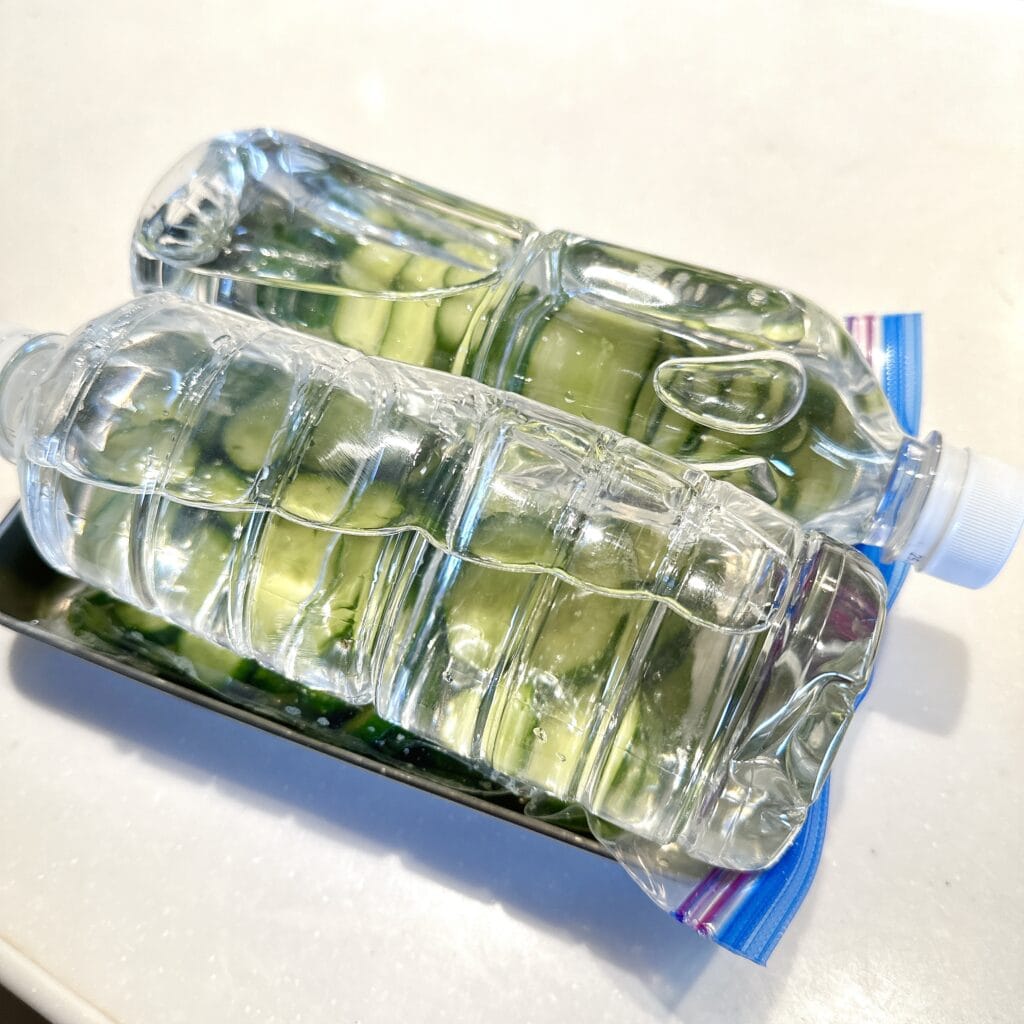 塩と一緒に袋に入れてよく揉み、重しを乗せてしばらく冷蔵庫で放置。