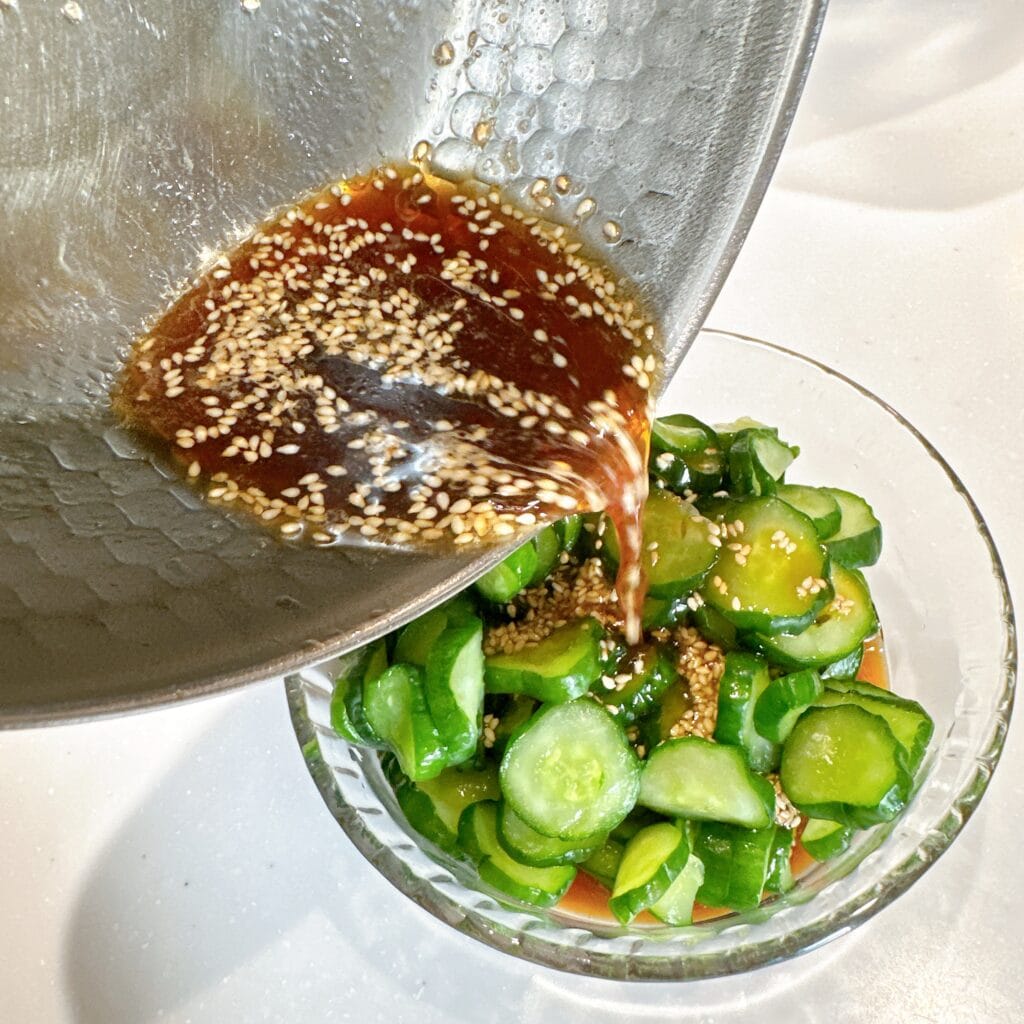 きゅうりからたくさん水が出てくるので、ギューッとしぼって、ひと煮立ちさせた(A)とごまをそそいでササっと混ぜたら完成です!簡単!イェイ!