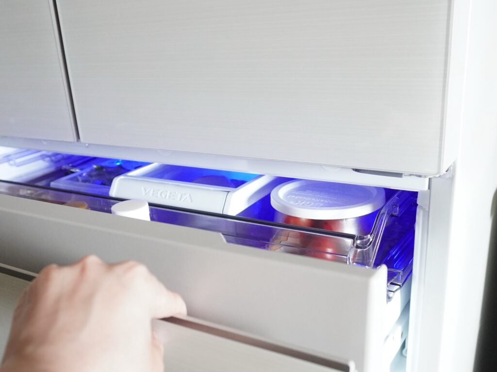 野菜のみずみずしさを保つ「もっと潤う摘みたて野菜室」を搭載しているこの野菜室には、定期的に冷気を送り込んでくれてるようでありがたい。