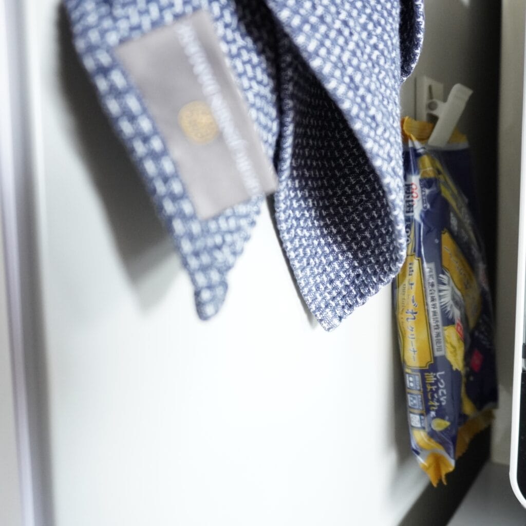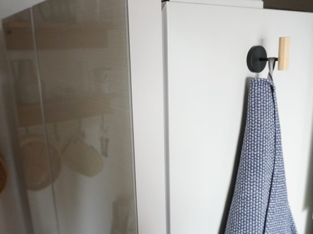 冷蔵庫の側面はマグネットがついた◎タオルをかけるフックはココ!と決めています。