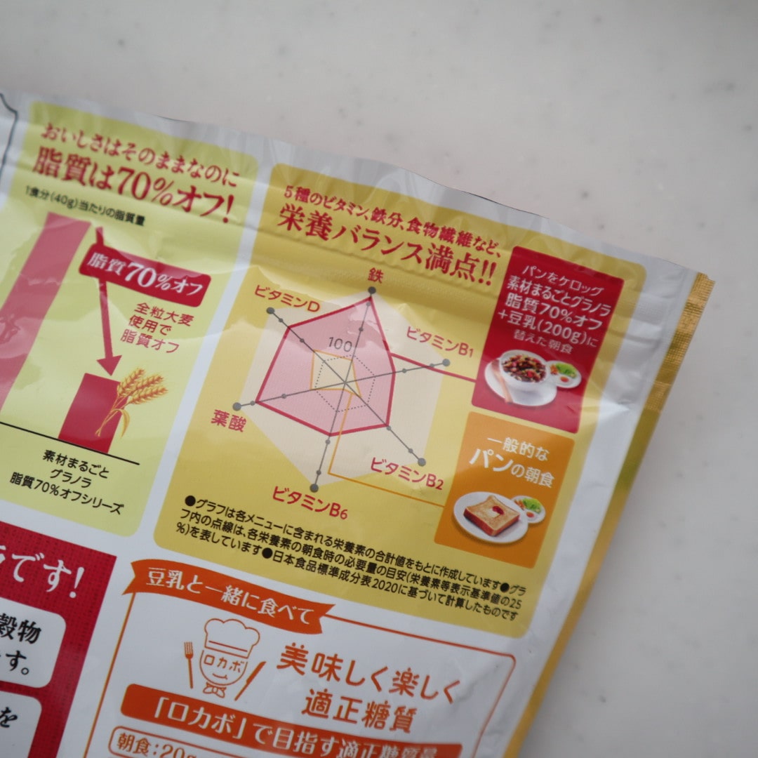 グラフを見てびっくり!忙しいときは、食パン1枚なんてことが多い方も、「素材まるごとグラノラ 脂質70%オフ」なら、うれしい栄養も摂れていいですよね◎