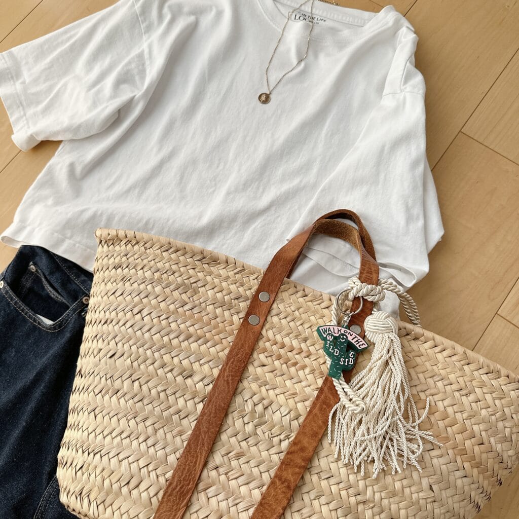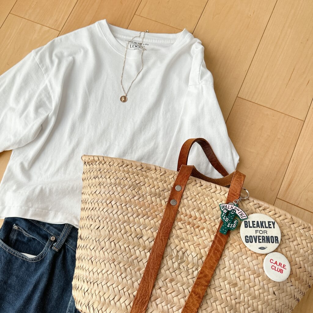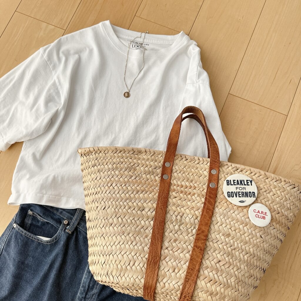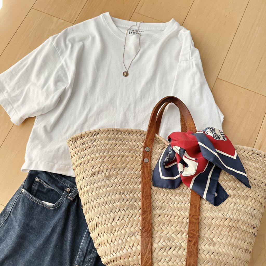 シンプルなTシャツ+デニムコーデがかごバッグアレンジによってどう変わるか!
