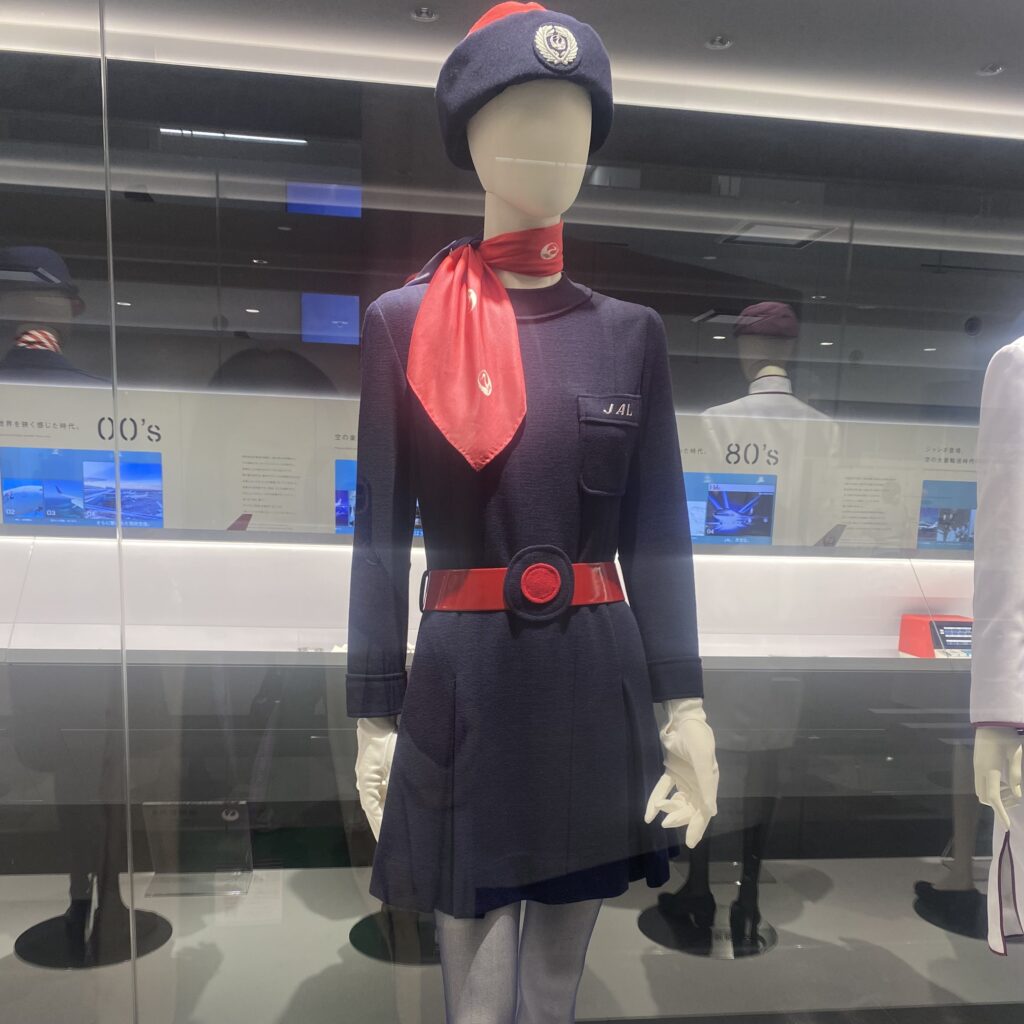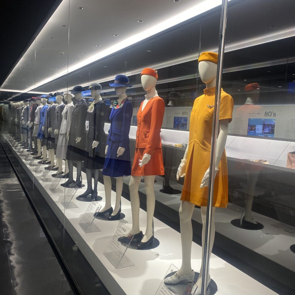 まず展示で目を惹くのが、歴代のJALの客室乗務員さんの制服!