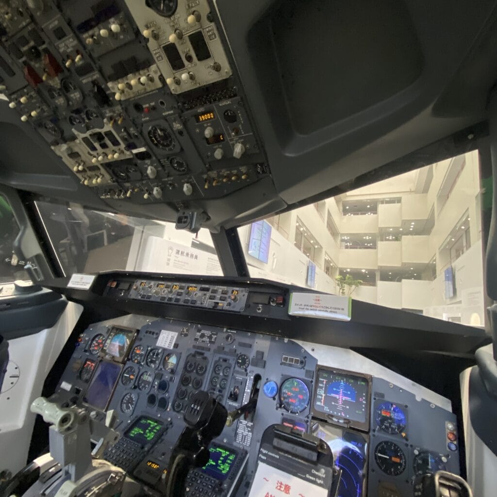 たくさんのスイッチやレバーを目の前にして、「こんなにたくさんのスイッチを操作しているのかな…」と気が遠くなりながら、改めてパイロットの方々に敬意を感じずにはいられませんでした。
