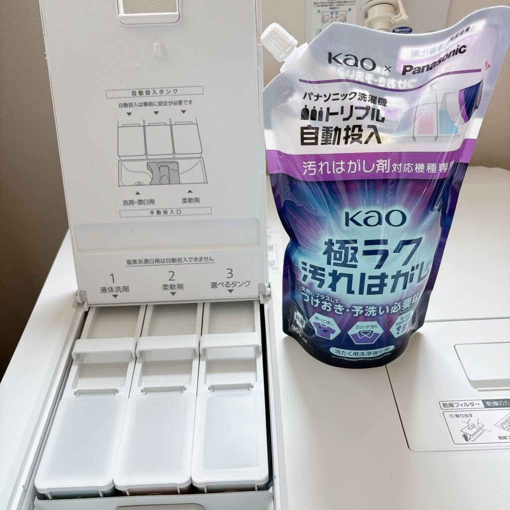 ここから力説したいんですけど、いいですか?Panasonicの洗濯乾燥機には家電量販店とネット限定販売の『kao 極ラク汚れはがし』って洗剤があるんですよ。せっかくなので洗濯乾燥機買う時に一緒に買ってみて、自動投入3つ目の『選べるタンク』に入れてみたのね。