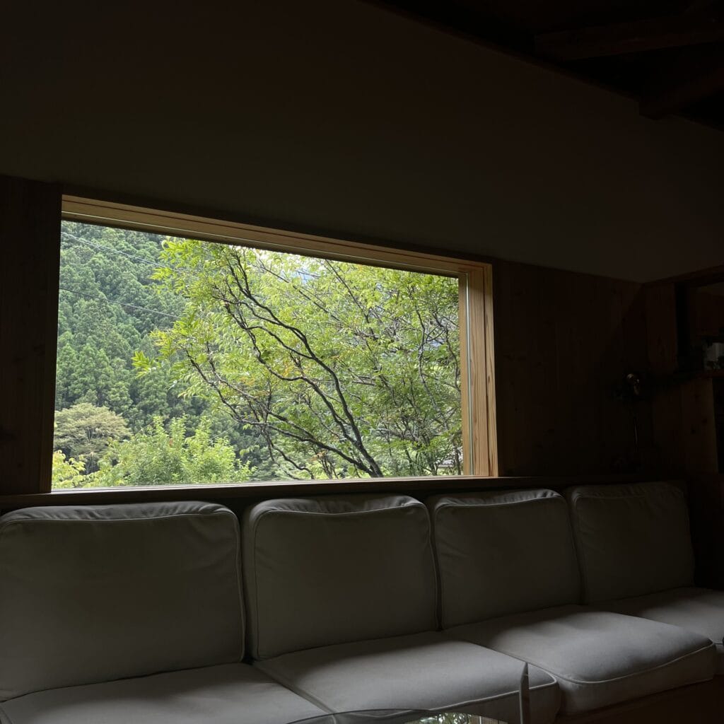 窓の外は美しい木々。